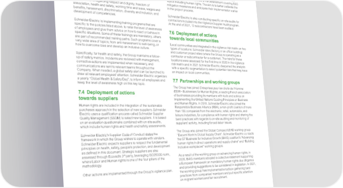 www.se.com Schneider Electric 18 2021 Trust Report 7.3 Deployment of internal actions Schneider Electric entities and subsidiaries are monitored through the implementation of Key Internal Controls. These controls are designed in co-ordination with the Internal Audit team and consist in an annual self-assessment covering different operational topics. Human rights and health and safety controls are included in this annual review. The results of these assessments allow Schneider Electric to benchmark the entities and to prioritize mitigation plans when necessary. Internal actions regarding respect and dignity, freedom of association, health and safety, working time and leave, wages and benefits, harassment, discrimination, diversity and inclusion, and development of competencies. Schneider Electric is implementing training programs that are specific to the policies listed above, to raise the level of awareness of employees and give them advice on how to react or behave in specific situations. Some of these trainings are mandatory, others are part of recommended training paths. Such programs cover a very wide area of topics, from anti-harassment to well-being, or how to overcome bias and develop an inclusive culture. Specifically, for health and safety, the Group maintains a follow- up of safety metrics. Incidents are reviewed with management, corrective actions are implemented when necessary, and communications are sent to relevant teams throughout the Company. When needed, a global safety alert can be launched to draw all relevant employees’ attention. Schneider Electric organizes a yearly “Global Health & Safety Day”, to inform all employees and keep the level of awareness high on this key topic. 7.4 Deployment of actions towards suppliers Human rights are included in the integration of the sustainable purchases approach in the selection of new suppliers. Schneider Electric uses a qualification process called Schneider Supplier Quality Management (SSQM) to select new suppliers. It is based on an evaluation questionnaire combined with on-site audits, which include human rights and health and safety assessments. Schneider Electric’s Supplier Code of Conduct states the framework in which the Group wishes to operate with vendors. Schneider Electric expects suppliers to respect the fundamental principles on health, safety, people’s protection, and development as defined in this document. Strategic suppliers are also assessed through Ecovadis 3 rd party, leveraging ISO26000 norm, where Labor and Human rights is one of the four pillars of the methodology. Other actions are implemented through the Group’s vigilance plan. 7.5 Deployment of actions towards contractors Schneider Electric has developed specific actions to mitigate human rights risks related to project execution environment, anywhere co-ordination with project contractors is necessary. The Group is working on the evolution of the project decision- making process to incorporate a risk assessment covering ESG topics including human rights. The aim is to better calibrate the mitigation measures and anticipate their implementation earlier in the project process. Schneider Electric is also conducting specific on-site audits for contractors included into the Vigilance Supplier Audit program. At the end of 2021, 13 subcontractors have been audited. 7.6 Deployment of actions towards local communities Local communities are integrated in the vigilance risk matrix on two types of locations: Schneider sites (factory or an office building) and customer project sites (where the Group is operating as a contractor or subcontractor for a customer). The risks for these locations were assessed for the first time in 2020 in the vigilance risk matrix and in 2021 Schneider Electric deepened the analysis with a specific segmentation to select potential risks that may have an impact on local communities. 7.7 Partnerships and working groups The Group has joined Entreprises pour les droits de l’Homme (EDH – Businesses for Human Rights), a leading French association of businesses providing its members with tools and advice on implementing the United Nations Guiding Principles on Business and Human Rights. In 2018, Schneider Electric also joined the Responsible Business Alliance (RBA), a non-profit coalition of more than 120 companies from the electronic, retail, automobile, and leisure industries, for compliance with human rights and sharing the best practices with regards to on-site auditing and monitoring of suppliers’ activity, including forced-labor issues. The Group also joined the Global Compact LEAD working group “Decent Work in Global Supply Chain”. Schneider Electric co-leads the G7 Business for Inclusive Growth (B4IG) coalition’s “Advancing human rights in direct operations and supply chains” and “Building inclusive workplaces” working groups. As a result of the working group on advancing human rights, in 2020, B4IG members adopted a collective statement supporting a European framework on mandatory human rights due diligence and providing suggestions to be considered in legislation. In 2021, the working group has implemented a toolbox gathering best practices from companies’ members and put specific attention on migrant workers and fair recruitment.