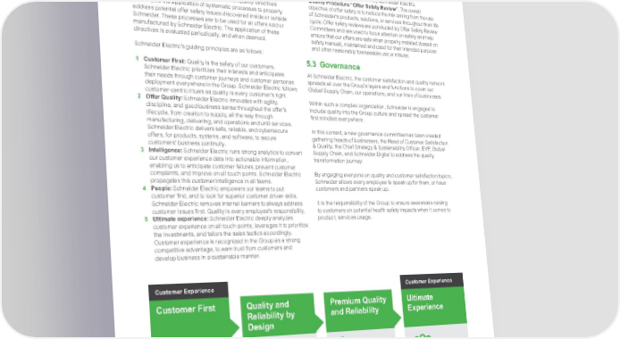 13 Life Is On | Schneider Electric www.se.com 2021 Trust Report Customer First Quality and Reliability by Design Premium Quality and Reliability Ultimate Experience Prioritize customers’ needs and react quickly, always going the extra mile Ensure business continuity in protecting people, assets and data Deliver through robust processes and digitized end-to-end supply chain React faster vs. competitors with analytics backbone and SE great people Customer Experience End to end offer quality Customer Experience It is the policy of Schneider to only sell products, solutions, and services which are safe when properly used for their intended purpose or for other reasonably foreseeable purposes contributing to the sustainability ambitions of the Group. It is the obligation of Schneider to notify customers of safety issues caused by its offer that may result in bodily injury or property damage, and include instructions for immediate remedial actions, even after the end of the useful life of the offer. Schneider Electric benefits from a full set of quality directives that require the application of systematic processes to properly address potential offer safety issues discovered inside or outside Schneider. These processes are to be used for all offers sold or manufactured by Schneider Electric. The application of these directives is evaluated periodically, and when deemed. Schneider Electric’s guiding principles are as follows: 1 Customer First: Quality is the safety of our customers. Schneider Electric prioritizes their interests and anticipates their needs through customer journeys and customer personas deployment everywhere in the Group. Schneider Electric follows customer-centric rituals as quality is every customer’s right. 2 Offer Quality: Schneider Electric innovates with agility, discipline, and good business sense throughout the offer’s lifecycle, from creation to supply, all the way through manufacturing, delivering, and operations and until services. Schneider Electric delivers safe, reliable, and cybersecure offers, for products, systems, and software, to secure customers’ business continuity. 3 Intelligence: Schneider Electric runs strong analytics to convert our customer experience data into actionable information, enabling us to anticipate customer failures, prevent customer complaints, and improve on all touch points. Schneider Electric propagates this customer intelligence in all teams. 4 People: Schneider Electric empowers our teams to put customer first, and to look for superior customer driven skills. Schneider Electric removes internal barriers to always address customer issues first. Quality is every employee’s responsibility. 5 Ultimate experience: Schneider Electric deeply analyzes customer experience on all touch points, leverages it to prioritize the investments, and tailors the sales tactics accordingly. Customer experience is recognized in the Group as a strong competitive advantage, to earn trust from customers and develop business in a sustainable manner. There are directives and procedures, designed within dedicated committees to protect our Customers: • Quality Directive “Managing Customer Safety Risks” . This directive requires the application of Schneider Electric’s systematic processes to properly address potential offer safety risks of Bodily Injury or Property Damage, discovered inside or outside Schneider Electric. These processes are to be used for all offers sold or manufactured by Schneider Electric. • Quality Procedure “Offer Safety Review” . The overall objective of offer safety is to reduce the risk arising from the use of Schneider’s products, solutions, or services throughout their life cycle. Offer safety reviews are conducted by Offer Safety Review Committees and are used to focus attention on safety and help ensure that our offers are safe when properly installed (based on safety manual), maintained and used for their intended purpose and other reasonably foreseeable use or misuse. 5.3 Governance At Schneider Electric, the customer satisfaction and quality network spreads all over the Group’s layers and functions to cover our Global Supply Chain, our operations, and our lines of businesses. Within such a complex organization, Schneider is engaged to include quality into the Group culture and spread the customer first mindset everywhere. In this context, a new governance committee has been created gathering heads of businesses, the Head of Customer Satisfaction & Quality, the Chief Strategy & Sustainability Officer, EVP, Global Supply Chain, and Schneider Digital to address the quality transformation journey. By engaging everyone on quality and customer satisfaction topics, Schneider allows every employee to speak up for them, or have customers and partners speak up. It is the responsibility of the Group to ensure awareness-raising to customers on potential health safety impacts when it comes to product, services usage.