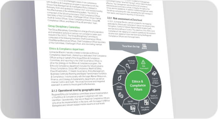 www.se.com Schneider Electric 6 2021 Trust Report 2.1.2 Corporate level The Group Ethics & Compliance Committee is assisted by the Group Operational Compliance Committee (GOCC) and the Group Disciplinary Committee, which both ensure effectiveness of the speak-up culture (a culture in which employees feel free and psychologically safe to share their ideas, opinions, and concerns, without fear of retaliation) and whistleblowing system, and fair and transparent disciplinary policy. Group Operational Compliance Committee The GOCC detects and manages cases of non-compliance with the Ethics & Compliance program in accordance with the Group Case Management & Investigation Policy released in February 2020 and updated in October 2021, and reviews monthly the effectiveness of the whistleblowing system. The GOCC is composed of the following members: Chief Compliance Officer (secretary of the Committee), Chief Legal Officer, Group Internal Audit & Control Officer, Group Compliance Director, Group HR Compliance Officer, and Head of Fraud Examination Team. Group Disciplinary Committee The Group Disciplinary Committee is in charge of levying sanctions and remediation actions on serious non-compliance cases upon request of the GOCC. The Group Disciplinary Committee is composed of the following members: Chief Governance Officer, Chief Human Resources Officer, Chief Compliance Officer (secretary of the Committee), Chief Legal Officer, and one rotating member. Ethics & Compliance department Schneider Electric has also created a standalone Ethics & Compliance department, chaired by a dedicated Chief Compliance Officer acting on behalf of the Group Ethics & Compliance Committee, and reporting to the Chief Governance Officer, to drive the strategy on the Ethics & Compliance program. The Ethics & Compliance department includes the following teams: Group Compliance, Group HR Compliance, Health & Safety, Fraud Examination, IT Assets Governance, Policy Management, Business Continuity Planning and Digital Transformation for Ethics & Compliance. It works closely with the Legal, Human Resources, Finance, and Strategy & Sustainability departments, as well as Internal Control and Audit. This cross-functional and integrated approach is central to the program’s effectiveness. 2.1.3 Operational level by geographic zone Regional Ethics & Compliance committees ensure implementation of the Ethics & Compliance program in alignment with risks identified. Operationally, they rely on Regional Compliance Officers who drive the implementation in the zone, with the support of Ethics Delegates and relevant subject matter experts at local levels. 2.2 Pillars of the Ethics & Compliance program All Schneider Electric employees are expected to comply with Schneider’s Ethics & Compliance program. Its daily application helps them to act with integrity and transparency, and to comply with all international and local regulations. The Ethics & Compliance program is based on management commitment (called “tone from the top”), which makes its pillars effective. Top management sets the Ethics & Compliance standards and promotes a culture of integrity throughout the Group and its operations. In addition, middle management walks the talk by complying with rules, spreading the right message in their teams, and supports reporting of misconducts. 2.2.1 Risk assessment at Zone level In 2021, Schneider Electric carried out specific risk mapping dedicated to “Ethics and Compliance” risks on the following risks: Corruption, Conflict of Interest, Human Rights & Labor Laws, and Sanctions & Export Control. The objective of this “Ethics and Compliance” risk mapping is to capture operational risk exposure at zone level, based on local interviews led by the Regional Compliance Officers and the Legal teams. Ethics & Compliance Pillars Code of conduct & Policies Training & Awareness Third parties compliance Specific accounting controls Whistle blowing Disciplinary measures Monitoring & Audit Risk Assessment Tone from the top The process at regional level was as follow: • step 1 – each region defined its local risk universe taking into account local specific risks, • step 2 – each region assessed its gross risks and effectiveness of its local mitigation measures, generating a mapping of regional net risks, and • step 3 – each region defined action plans (validated by the respective regional Ethics & Compliance committees) to reduce the risk exposure. In addition, a global gross and net risks mapping was consolidated at Group level, as well as a set of action plans to be taken at global level. All action plans will be monitored during the course of 2022.