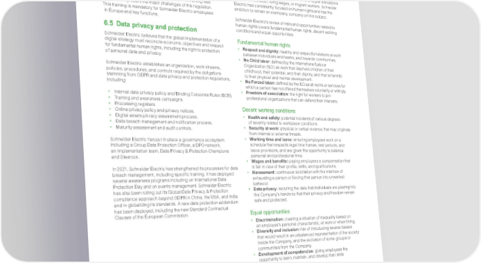 www.se.com Schneider Electric 16 2021 Trust Report 6.4 Training and awareness Online training on cybersecurity is mandatory for all employees. This training helps employees to understand what cyber threats they may face and how they should behave to be protected from the risks. At the end of 2021, 99% of Schneider Electric employees have completed this training. Specific employee categories received mandatory training for risks linked to their activity. Schneider Electric implemented the General Data Protection Regulation (GDPR) requirements and specific training was launched to present the major challenges of this regulation. This training is mandatory for Schneider Electric employees in Europe and key functions. 6.5 Data privacy and protection Schneider Electric believes that the global implementation of a digital strategy must reconcile economic objectives and respect for fundamental human rights, including the right to protection of personal data and privacy. Schneider Electric establishes an organization, work streams, policies, procedures, and controls required by the obligations stemming from GDPR and data privacy and protection regulations, including: • Internal data privacy policy and Binding Corporate Rules (BCR). • Training and awareness campaigns. • Processing registers. • Online privacy policy and privacy notices. • Digital assets privacy assessment process. • Data breach management and notification process. • Maturity assessment and audit controls. Schneider Electric has put in place a governance ecosystem including a Group Data Protection Officer, a DPO network, an implementation team, Data Privacy & Protection Champions and Steercos. In 2021, Schneider Electric has strengthened its processes for data breach management, including specific training. It has deployed several awareness programs including on International Data Protection Day and on events management. Schneider Electric has also been rolling out its Global Data Privacy & Protection compliance approach beyond GDPR in China, the USA, and India and in globalizing its standards. A new data protection addendum has been deployed, including the new Standard Contractual Clauses of the European Commission. 7 Human rights 7.1 Risks and opportunities Human rights, which have been a main priority of the Group for a long time, have been growing in terms of risk exposure, due to the increase of legal enforcement, geopolitical influence, and new challenges raised by social, economic, and digital disruptions such as forced labor, living wages, or migrant workers. Schneider Electric has consistently focused on human rights and has the ambition to remain an exemplary company on this subject. Schneider Electric’s review of risks and opportunities related to human rights covers fundamental human rights, decent working conditions and equal opportunities. Fundamental human rights • Respect and dignity: healthy and respectful relations at work between individuals and teams, and towards communities. • No Child labor: defined by the International Labour Organization (ILO) as work that deprives children of their childhood, their potential, and their dignity, and that is harmful to their physical and mental development. • No Forced labor: defined by the ILO as all works or services for which a person has not offered themselves voluntarily or willingly. • Freedom of association: the right for workers to join professional organizations that can defend their interests. Decent working conditions • Health and safety: potential incidents of various degrees of severity related to workplace conditions. • Security at work: physical or verbal violence that may originate from internal or external threats. • Working time and leave: ensuring employees work on a schedule that respects legal time frames, rest periods, and leave provisions, and are given the opportunity to balance personal and professional time. • Wages and benefits: paying employees a compensation that is fair in view of their profile, skills, and qualifications. • Harassment: continuous solicitation with the intention of exhausting a person or forcing that person into unwanted behavior. • Data privacy: securing the data that individuals are placing into the Company’s hands so that their privacy and freedom remain safe and protected. Equal opportunities • Discrimination: creating a situation of inequality based on an employee’s personal characteristic, at work or when hiring. • Diversity and inclusion: risk of introducing several biases that would result in an unbalanced representation of the society inside the Company, and the exclusion of some groups or communities from the Company. • Development of competencies: giving employees the opportunity to learn, maintain, and develop their skills and abilities.