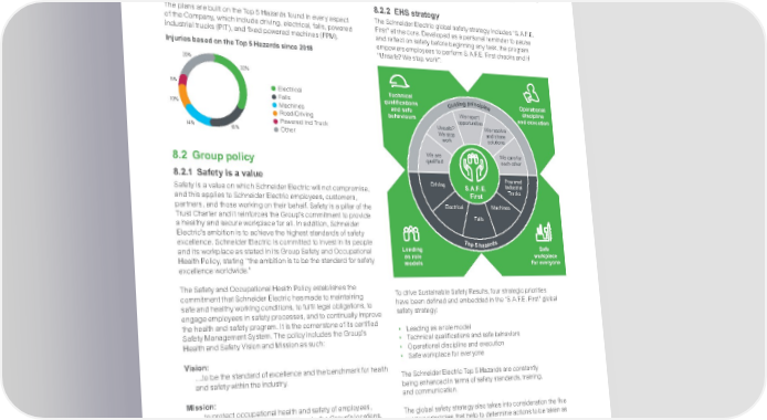 19 Life Is On | Schneider Electric www.se.com 2021 Trust Report 8 Employee health and safety 8.1 Risks and opportunities At Schneider Electric, risk assessments and strategic action plans are performed, based on the primary risks associated with the workplaces. These plans include opportunities to reduce serious and fatal incidents, maintain legal compliance, provide safe working conditions, and encourage employee engagement in the safety processes throughout the organization. The plans are built on the Top 5 Hazards found in every aspect of the Company, which include driving, electrical, falls, powered industrial trucks (PIT), and fixed powered machines (FPM). Injuries based on the Top 5 Hazards since 2018 32% 20% 19% 14% 10% 5% Electrical Falls Machines Road/Driving Powered Ind Truck Other 8.2 Group policy 8.2.1 Safety is a value Safety is a value on which Schneider Electric will not compromise, and this applies to Schneider Electric employees, customers, partners, and those working on their behalf. Safety is a pillar of the Trust Charter and it reinforces the Group’s commitment to provide a healthy and secure workplace for all. In addition, Schneider Electric’s ambition is to achieve the highest standards of safety excellence. Schneider Electric is committed to invest in its people and its workplace as stated in its Group Safety and Occupational Health Policy, stating “the ambition is to be the standard for safety excellence worldwide.” The Safety and Occupational Health Policy establishes the commitment that Schneider Electric has made to maintaining safe and healthy working conditions, to fulfil legal obligations, to engage employees in safety processes, and to continually improve the health and safety program. It is the cornerstone of its certified Safety Management System. The policy includes the Group’s Health and Safety Vision and Mission as such: Vision: ...to be the standard of excellence and the benchmark for health and safety within the industry. Mission: ...to protect occupational health and safety of employees, customers, contractors, and visitors, in the Group’s locations, at offsite locations, and while travelling... ...to preserve Company license to operate through robust EHS compliance and risk management... ...to provide employees safe, pleasant, and efficient workplaces for enhanced well-being and effectiveness... ...to enhance our brand image and contribute to world sustainability through employees’ behavior and innovation. In 2021, as part of its improvement efforts, Schneider Electric successfully achieved re-certification for ISO 45001 Safety Management System as part a fully integrated management system certified through Bureau Veritas. This certification is in place for over 200 locations, including 176 manufacturing and logistics sites and the central office. 8.2.2 EHS strategy The Schneider Electric global safety strategy includes “S.A.F.E. First” at the core. Developed as a personal reminder to pause and reflect on safety before beginning any task, the program empowers employees to perform S.A.F.E. First checks and if “Unsafe? We stop work”. Powered Industrial Trucks Machines Falls Electrical Driving T o p 5 h a z a r d s Technical qualifications and safe behaviours Operational discipline and execution Leading as role models Safe workplace for everyone We report opportunities We resolve and share solutions We care for each other We are qualified Unsafe? We stop work G u i d i n g p r i n c i p l e s S.A.F.E. First To drive Sustainable Safety Results, four strategic priorities have been defined and embedded in the “S.A.F.E. First” global safety strategy: • Leading as a role model • Technical qualifications and safe behaviors • Operational discipline and execution • Safe workplace for everyone The Schneider Electric Top 5 Hazards are constantly being enhanced in terms of safety standards, training, and communication. The global safety strategy also takes into consideration the five guiding principles that help to determine actions to be taken as part of a work task. They are: • Ensuring employees are qualified for the work task before performing work. • Empowering employees to stop work if unsafe. • Reporting opportunities for improvement. • Resolving and sharing solutions to problems. • Encouraging employees to care about their own safety and the safety of their co-workers and customers.