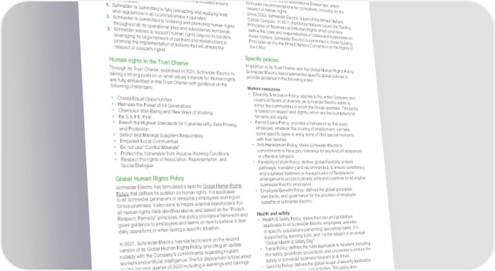 17 Life Is On | Schneider Electric 2021 Trust Report In accordance with the 2017 French duty of vigilance law and its ambition to behave as an exemplary company, Schneider Electric implemented a specific vigilance plan. In 2021, Schneider reviewed and updated its “duty of vigilance risk matrix” which highlights human rights risks at its sites, as well as for suppliers, contractors, and local communities. Several actions are implemented to mitigate the highest identified risks in this matrix. 7.2 G roup policy Schneider Electric’s human rights approach is articulated around three principles. 1. S chneider is committed to fully respecting and applying laws and regulations in all countries where it operates. 2. S chneider is committed to fostering and promoting human rights throughout all its operational sites and subsidiaries worldwide. 3. S chneider wishes to support human rights beyond its borders, leveraging its large network of partners and stakeholders to promote the implementation of actions that will ensure the respect of people’s rights. Human rights in the Trust Charter Through its Trust Charter, published in 2021, Schneider Electric is taking a strong position on what values it stands for. Human rights are fully embedded in this Trust Charter with guidance on the following challenges: • C reate Equal Opportunities • H arness the Power of All Generations • C hampion Well-Being and New Ways of Working • B e S.A.F.E. First • R each the Highest Standards for Cybersecurity, Data Privacy, and Protection • S elect and Manage Suppliers Responsibly • E mpower Local Communities • D o not use “Conflict Minerals” • P rotect the Vulnerable from Abusive Working Conditions • Respect the rights of Association, Representation, and Social Dialogue Gl obal Huma n R ights Po licy Schneider Electric has formulated a specific Globa l Hu ma n Rights Policy that defines its position on human rights. It is applicable to all S chneider p ermanent o r temporary em ployees w orking o n Group pr emises. I t also a ims t o inspire e xtern al s takeholders. F or all human rights risks identified above, and based on the “Protect, Respect, R emedy” pr inciples, t he p olicy pr ovides a f ram ework a nd gives guidance to employees and teams on how to behave in their daily o perations o r when f acing a s pecific s ituation. In 2021, Schneider Electric has started to work on the second version of its Global Human Rights Policy, providing an update notably with the Company’s commitments regarding migrant workers and artificial intelligence. The full deployment is forecasted for the second quarter of 2022 including e-learnings and trainings modules. www.se.com Alignment with international standards and frameworks Schneider Electric adheres to the following principles or guidelines: • T he ILO Declaration on Fundamental Principles and Rights at Work. • T he international human rights principles encompassed in the Universal Declaration of Human Rights, which sets out a common standard for all types of organization. • T he OECD Guidelines for Multinational Enterprises, which formulate recommendations for companies, including for the respect of human rights. • S ince 2003, Schneider Electric is part of the United Nations Global Compact. In 2011, the United Nations issued the Guiding Principles on Business and Human Rights which precisely define the roles and responsibilities of States and businesses on these matters. Schneider Electric is committed to these Guiding Principles and to the United Nations Convention on the Rights of the Child. Specific policies In addition to its Trust Charter and the Global Human Rights Policy, Schneider Electric has implemented specific global policies to provide guidance in the following areas: Human resources • D iversity & Inclusion Policy: applies to the entire Company and covers all facets of diversity, as Schneider Electric wants to mirror the communities in which the Group operates. This policy is based on respect and dignity, which are the foundations for fairness and equity. • F amily Leave Policy: provides a framework so that every employee, whatever the country of employment, can take some specific leave to enjoy some of life’s special moments with their families. • A nti-Harassment Policy: states Schneider Electric’s commitments to have zero-tolerance for any kind of harassment or offensive behavior. • F lexibility at Work Policy: defines global Flexibility at Work pathways, mandatory and recommended, to ensure consistency and equitable treatment in the application of flexible work arrangements across business units and countries for all eligible Schneider Electric employees. • E mployee Benefits Policy: defines the global principles, standards, and governance for the provision of employee benefits at Schneider Electric. Health and safety • H ealth & Safety Policy: states the rules and guidelines applicable to all Schneider Electric employees, and also to specific populations performing specialized tasks. It is supported by learning tools, and it is the subject of an annual “Global Health & Safety Day”. • T ravel Policy: defines the rules applicable to travelers, including the safety guidelines, procedures, and processes to ensure the safety of Schneider business travelers at all times. • S ecurity Policy: defines the global scope of security applicable to all entities, locations, and activities. This policy also emphasizes the crucial role of managers to ensure security.