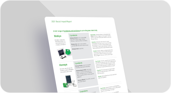 www.se.com Schneider Electric 6 2021 Social Impact Report Case Study: Schneider Electric, its Foundation and ADEME, the French Agency for Ecological Transition, partner to provide 45,000 solar lanterns to vulnerable women in Africa. Objective: Distribute solar lanterns to women entrepreneurs in order to extend hours of activities and livelihood, as well as underprivileged women and families in order to enjoy lighting for nighttime home activities and limit the use of kerosene lamps. Solution: Mobiya Original. An impact study will be conducted, measuring the benefits of the solution across the five African countries of the project: Kenya, Nigeria, Cameroon, Benin, and Senegal. Case Study: 300,000+ people living in remote and rural areas of Cambodia have been provided access to clean and reliable electricity through Schneider Electric’s solar home systems, supplied under the government funded rural electrification program. Objective: Provide access to energy for basic lighting for domestic needs, mobile charging, and rice cookers. Solution: Homaya Family and other customized solar home systems. Case Study: Schneider Electric and La Salle Solidarieta Internazionale ONLUS (NGO) join forces to empower local communities with competencies in energy management in Chad. Objective: Train 250 students per year in electrical distribution, industrial control, and renewable energies focused on practical experience. Solution: Didactic benches to equip electrical labs in training centers in N’djaména and Kélo in Chad. Case Study: Schneider Electric and Entrepreneur du Monde (NGO) launched a project to bring reliable power for onion storage in Senegal. Objective: Develop a low cost, decentralized generation of refreshed storage buildings that can conserve onions for several months as 30% to 60% of Senegalese onions’ production rot due to lack of storage. Solution: Villaya Community 25 kW with sodium- nickel batteries and Villaya Edge Control software in order to ensure reliable power supplying cooling system and some income generating activities. 3 products Mobiya Original: solar powered LED lamp with mobile charge, offering 48 hours of lighting without recharging Mobiya Lite: lighter solar powered portable LED lamp with mobile charger Mobiya Front: head lamp 3 products Homaya Family: solar home system including a solar panel and lamps Homaya Family PAYG: solar home system including a solar panel and lamps, and Pay-As-You-Go function fully compatible with all mobile payment platforms Homaya Hybrid: AC and DC, solar and grid home system Offer Didactical benches for training electricians, installers, facility managers, entrepreneurs, and trainers, covering the management of high and low voltage, electrical distribution, building management, global energy management, and process and machine management. 6 solutions Villaya Community: solar or hybrid microgrid to power rural communities Villaya Agri-Business: solar power plant to provide electricity and/or hot water to agriculture Villaya Emergency: containerized solar or hybrid microgrid to provide electricity in emergencies Villaya Water: solar water pumping system Villaya Lighting: solar street lighting Villaya Recharge: USB charging station Including EcoStruxure ™ for Energy Access, an affordable, flexible, and open platform using analytics to improve the profitability and efficiency of electricity microgrid. Mobiya Portable, robust, and affordable solution for individual lighting and charging a cell phone Homaya Domestic electrification for access to quality, affordable, and uninterrupted power Didactic Educational tools for the vocational and higher education fields Villaya Collective electrification solutions in remote sites, either 100% solar or hybrid A full range of produ cts and solutions to p rovide green electricity
