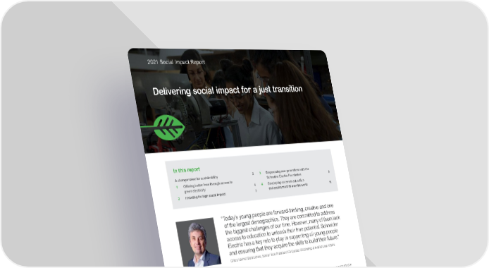 2021 Social Impact Report Delivering social impact for a just transition In this report A changemaker for sustainability 2 1 Offering better lives through access to green electricity 4 2 Investing for high social impact 7 3 Empowering new generations with the Schneider Electric Foundation 9 4 Developing access to education and employment all over the world 14 “ Today’s young people are forward-thinking, creative and one of the largest demographics. They are committed to address the biggest challenges of our time. However, many of them lack access to education to unleash their true potential. Schneider Electric has a key role to play in supporting all young people and ensuring that they acquire the skills to build their future.” Gilles Vermot Desroches, Senior Vice President Corporate Citizenship & Institutional Affairs Context and goals Schneider Electric has been building a sustainable development approach since the late 1990s thanks to the Schneider Sustainability Impact, measuring the Company’s objectives and progress every quarter. These objectives have always taken into account all dimensions of responsibility – environmental, social, territorial, and governance – encompassing all the Group’s stakeholders on a global scale. In 2021, Schneider Electric was recognized by Corporate Knights as the World’s Most Sustainable Corporation out of 5,000 companies surveyed. All of this prompted the Group to get moving, to think about the world of tomorrow by building scenarios, both in the environmental and climate fields – but without forgetting the social and territorial dimensions. If the transition is not inclusive and fair, it will not allow people in underserved communities to build their future and create their own business. Schneider Electric Corporate Citizenship division, created in early 2021, embodies this vision. The planet has to be saved, and its inhabitants too. Four main lines of action have been defined. The first one is to ensure that the Group’s business partners respect all human rights for everyone, everywhere, at any time and in any situation, from decent work standards to the creation of a social label for the Group’s products. The second line of action is to ensure that everyone is supported in building their future, regardless of their generation. Schneider has always played an active role in the economic development of the communities in which it has a presence, in particular where people have no or poor access to energy through dedicated products offers and socially responsible investments for impact. This focus is in line with the third major action, youth. There have never been so many young people on the planet, but many have no access to training. Yet it is young people who bring innovation. The Company has a role to play in supporting them and ensuring that they acquire the skills to build their future. This is the mission of the Schneider Electric Foundation, to give them the means to do so. The first of these means is training, the Foundation’s historical activity. It has already enabled more than 300,000 young people around the world to receive professional training in energy-related professions. These are essential jobs for the future in a world that is becoming increasingly electrified and digitized and where access to energy is still difficult for millions of people. The fourth approach is to make citizenship a collective commitment to co-construct the future in a dynamic way by learning and sharing with many different initiatives.
