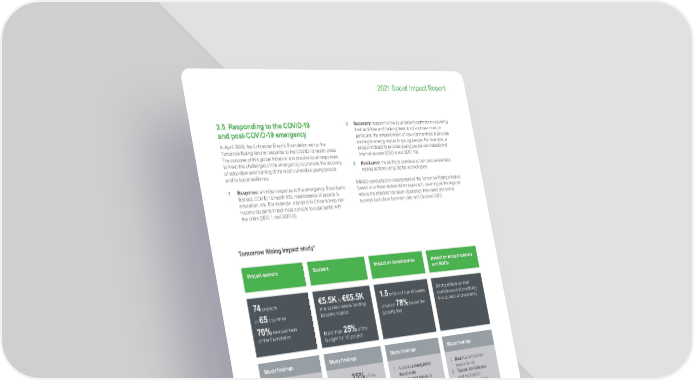 11 Life Is On | Schneider Electric www.se.com 2021 Social Impact Report 3.5 Responding to the COVID-19 and post-COVID-19 emergency In April 2020, the Schneider Electric Foundation set up the Tomorrow Rising fund in response to the COVID-19 health crisis. The purpose of this global initiative is to provide local responses to meet the challenges of the emergency, to promote the recovery of education and training of the most vulnerable young people and to boost resilience. 1 Response: an initial response to the emergency. Food bank, first aid, COVID-19 health kits, maintenance of access to education, etc. For example, a project in China to help low- income students in technical schools to cope better with the crisis (SDG 1 and SDG 4); 2 Recovery: support to the Foundation’s partners in resuming their activities and helping them to roll-out new ones, in particular, the establishment of new partnerships to provide training in energy trades to young people. For example, a project in Brazil to provide young people with tablets and internet access (SDG 4 and SDG 10); 3 Resilience: the ability to continue to train and awareness- raising actions using digital technologies. KiMSO conducted an assessment of the Tomorrow Rising initiative, based on a three-stakeholders approach, covering all the regions where the initiative has been deployed. Interviews and online surveys took place between July and October 2020. 74 projects in 65 countries 70% new partners of the Foundation €5.5K to €65.5K In a context where funding became scarce More than 25% of the budget for 1/3 project 1.5 million of beneficiaries of which 78% below the poverty line Strong effects on their confidence and credibility in a context of uncertainty Tomorrow Rising Impact study* * This qualitative and quantitative study was conducted in 2020 by KIMSO, Research & Consulting in social impact assessment. The online survey covered all affected areas and resulted in a 60% response rate (37 answers). Scores “quite agree/completely agree” are bundled in % figures. ** Many project owners also mentioned emerging needs to due the crisis, such as employment and health. Priorities for project owners (Emergency aid should not replace long-term support) • 54% more budget • 51% unrestricted financial support (for project and running costs) • 49% over-time fundings • 46% to be put in contact with other funders Project owners Support Impact on beneficiaries Impact on project owners and NGOs Study findings 89% answering to an emergency situation 68% Specific projects created to face the COVID-19 health crisis 75% addressing existing needs that have increased due to the COVID-19 crisis** (food, education, housing...) Study findings Crucial for 35% of the NGOs Quick and flexible 87% were able to fill In the funding request form easily Study findings 1. Access emergency food aids 2. Get digital tools for school/studies 3. Keep hope about the future 4. Access protective medical equipment or hygiene kits Study findings 1. Meet beneficiaries needs for all 2. Teams confidence and motivation 3. New relationships with partners 4. Greater visibility