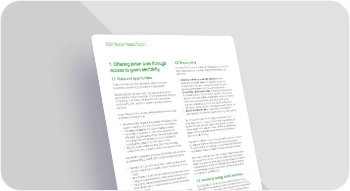 www.se.com Schneider Electric 4 2021 Social Impact Report 1 Offering better lives through access to green electricity 1.1 Risks and opportunities Today, more than two billion people have little or no access to electricity, representing 25% of the world’s population. Notable progress has been made on energy access in recent years, with the number of people living without electricity dropping to 759 million in 2019 from one billion in 2016 (1) . Nonetheless, as SEforAll (2) puts it, “electricity access is growing, but not for everyone”. In sub-Saharan Africa, colossal additional efforts must be made to achieve universal access: • About 600 million people in sub-Saharan Africa do not have access to electricity, i.e., more than one in two inhabitants; • This trend is increasing, due to demographic pressure; • The COVID-19 pandemic will have further amplified the difficulties of access to electricity in the most fragile areas; according to SEforAll, the pandemic could increase the non-electrified population by 100 million in 2020; • By 2030, on the current trajectory, 85% of the remaining unelectrified world population will be in sub-Saharan Africa. Asia-Pacific is approaching universal electrification with ambitious government off-grid electrification and grid extension programs: • Between 2000 and 2018, more than 1.4 billion people gained access to electricity worldwide, mainly in developing countries in Asia; • Nevertheless, the grid can be unreliable in remote areas, where it must be supplemented with solar-powered backup solutions; • The growing need for equipment and electrical appliances for productive use in rural areas must be met with renewable energy solutions. In addition to the 759 million people without electricity access, an estimated one billion people have access to intermittent, unreliable, or dangerous electricity. To achieve United Nations Sustainable Development Goal 7 (SDG 7), access to affordable, reliable, sustainable, and modern energy must be a major objective, as the lack of energy affects the poorest: among the energy poor, three quarters are also multidimensionally poor in terms of human development 2 . Access to green electricity offers a chance to live a better life, as it can have a positive multiplier effect on all socio-economic dimensions of the individual or community: livelihood, health, education, security, and empowerment of women, while fighting against climate change by replacing fossil solutions. (1) Source: Tracking SDG 7: The Energy Progress Report, produced by the International Energy Agency (IEA), the International Renewable Energy Agency (IRENA), the United Nations Statistics Division (UNSD), the World Bank, and the World Health Organization (WHO). (2) Using the Global Multidimensional Poverty Index. 1.2 Group policy Schneider Electric launched its Access to Energy program in 2009, with a unique approach combining three dimensions that enrich each other: • A training and entrepreneurship program aimed at developing skills in the electricity trades and supporting entrepreneurs in this area, in particular women, in order to promote sustainable and inclusive local development. • A social and inclusive business, with products and solutions for rural electrification (collective and individual, such as solar lanterns, solar home systems including Pay-As-You-Go features, solar water pumping systems, microgrids including plug and play containerized solutions, etc.), creating local jobs in distribution, energy services, electricity powered industries, etc. • Impact investment funds to support local economies in gaining access to modern energy and reducing energy poverty. The purpose of the Access to Energy social business is to bring clean electricity to populations in emerging markets both as a fundamental right and a means for social and economic development, with a safe, affordable, reliable, and sustainable energy offer. At Schneider, we call this Electricity for Life and Electricity for Livelihood. The ambition of the Access to Energy social business is to connect an additional 20 million people between 2021 and 2025, and 70 million by 2030. 34 million people have already benefited from the Schneider energy access solutions between 2009 and 2021. The impact investment funds will contribute to these targets, within the scope of the invested companies contributing to the mission of providing access to green electricity. More broadly, Schneider’s vision of impact investing is to fund high social impact initiatives, such as energy and digital services that enable all generations to contribute to a better future. 1.3 Access to energy social business Schneider Electric develops products and solutions to meet a range of both individual and community needs across the energy chain, from solar lanterns and solar home systems to decentralized small power plants, water pumping systems, and street lighting. These offerings also make it possible to maintain a sustainable economic and social activity as well as include and involve local communities in projects. 1.3.1 Governance A new governance of the Access to Energy business was put in place from 2021. It is placed under the responsibility of the Access to Energy Business Vice-President, reporting to the Sustainability Senior Vice-President. An advisory board dedicated to the subject has been set up, made up of the Chief Strategy & Sustainability Officer, the Energy Management Executive Vice-President, the International Operations Executive Vice-President, as well as the Sustainability Senior Vice-President and the Access to Energy Business Vice-President, and, once a year, the Chairman & CEO. The subject was also one of those reviewed in 2021 by the Schneider Electric Stakeholder Committee.