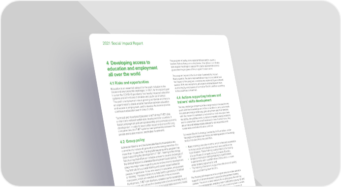 www.se.com Schneider Electric 14 2021 Social Impact Report 4 Developing access to education and employment all over the world 4.1 Risks and opportunities Education is an essential catalyst for the youth inclusion in the social and environmental challenges. In 2021, for the second year in a row the COVID-19 pandemic has heavily impacted education systems and left millions of children and youth out of school. The youth unemployment rate is growing worldwide and there is an urgent need to create a better transition between education and access to employment, and to develop the tools to provide continuous education even in time of crisis. Technical and Vocational Education and Training (TVET) play a vital role in national sustainable development for countries, it fosters employment and entrepreneurship, and promotes economic development. In order to have better impact and ensure life-long competencies, the TVET systems need partnership between the private and public sectors, and higher investments. 4.2 Group policy Schneider Electric and the Schneider Electric Foundation are committed to include all generations in the energy transition. For more than 10 years the Training & Entrepreneurship program has been supporting the development of TVET. Training in the energy field is a key that offers an inclusive answer to several challenges of the United Nations Sustainable Development Goals (SDGs). TVET plays two major roles regarding social and economic development. The first role is to provide training and career opportunities for people, in particular, those who are not in education, employment or training. The second role is to help build a generation of skilled manpower, which are needed at all levels of the economies. Furthermore, TVET can also be a valuable tool for sustainable development, as it allows the development of environmentally sound skills, critical for shifting toward a more sustainable economic model. The program has a specific focus on impacting people not in education, employment, or training, the youth, refugees, women in vulnerable situations, and marginalized groups of people. The actions are always implemented in partnership with local players and/or national or international non-profit organizations (NGOs, governments, etc.) and with Schneider Electric’s local subsidiary. Thanks to the ecosystem of partners, the program has supported the training of more than 300,000 people across Asia, South America, Africa, and Middle East since 2010. More than 5,000 trainers and 4,000 entrepreneurs have also been supported. The COVID-19 pandemic has heavily impacted education and increased inequalities. We are committed to go further and faster by reaching one million people trained by 2025, 10,000 entrepreneurs supported, and 10,000 trainers trained. From now on, the program will also operate in OECD countries. 4.3 Governance The Training & Entrepreneurship program follows the rules and governance of the Schneider Electric Foundation and Fondation de France . To increase effectiveness in following up the partnerships and achieve the 2025 ambition, the program organizes every six months zone meetings with the zone President, the Foundation representatives, and the Training & Entrepreneurship program leaders. Each zone has a defined ambition up to 2025 and a pipeline of projects that is reviewed. Corrective actions are implemented if necessary. The program is led by zone representatives and in-country leaders that exchange on a daily basis. One global co-ordinator sets regular meetings to support the zone representatives and guarantee the progress of the program in each zone. The program is part of the Schneider Sustainability Impact. Every quarter, the zone representatives report on a central tool the impact of the program, and data are reviewed by an external auditor. With rare exceptions, all projects-initiated benefit from monitoring by employees of Schneider Electric entities operating in the countries concerned. 4.4 Actions supporting trainees and trainers’ skills development The key challenge of training in the energy sector is to provide the youth with the knowledge and skills to be able to carry out a trade in a safe and responsible way, providing them and their families with the means for satisfactory subsistence. It will also give them the ability, should they wish, to sell and maintain energy solutions and to create their own small business in time. Furthermore, they are a vital and indispensable element for all responsible and sustainable rural electrification policies. Schneider Electric’s strategy, backed by its Foundation, under the aegis of Fondation de France , for training people in the energy sector, includes three key priorities: • Basic training over a few months, which is free and accessible to many people and adapted as much as possible to the local situation. These training courses lead to the issuing of a certificate of competence by Schneider Electric; • Single or multi-year trainings leading to qualifications, in partnership with local Ministries of Education, or even under bilateral agreements; and • The training of trainers to support the effective and quality roll-out of training down the line. The Training & Entrepreneurship program also provides valuable support to trainers involved in projects at its partners training centers. The aim is to help trainers thoroughly grasp the training approach and materials, enabling them to efficiently convey full and relevant knowledge to the students in short and long-term courses. Training of trainers ensures effective long-term transmission of quality, up-to-date knowledge finely tuned to the characteristics of today’s energy markets in the host country. Training of trainers is supported by the VolunteerIn association via missions at the partners training centers: “I helped to create an entire training module using a pragmatic and realistic approach. I feel like I’ve contributed to a better future 