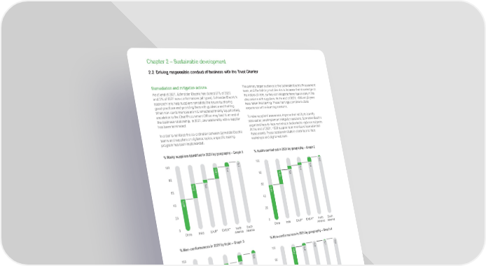 www.se.com Schneider Electric Universal Registration Document 2021 120 Chapter 2 – Sustainable development 2.2 Driving responsible conduct of business with the Trust Charter Remediation and mitigation actions As of end of 2021, Schneider Electric has closed 97% of 2020 and 3% of 2021 non-conformances (all types). Schneider Electric’s approach is to help suppliers remediate the issues by sharing good practices and providing them with guidance and training. When non-conformances are not remediated (mainly top priorities), escalation to the Chief Procurement Officer may lead to an end of the business relationship. In 2021, one relationship with a supplier has been terminated. In order to reinforce the co-ordination between Schneider Electric teams and suppliers on vigilance topics, a specific training program has been implemented. The primary target audience is the Schneider Electric Procurement team, and the training modules aim to increase their knowledge on the nature of risks, so they can integrate these topics early in the discussions with suppliers. At the end of 2021, ~580 employees have taken this training. These trainings combine in-class experience with e-learning sessions. To raise suppliers’ awareness, improve their ability to identify risks earlier, and implement mitigation solutions, Schneider Electric organized face-to-face workshops dedicated to vigilance subjects. At the end of 2021, ~500 supplier team members have attended these events. These sessions include in-class face-to-face workshops and digital webinars. 56% 39% 4% 0% 1% 0% 0 20 40 60 80 100 EAJP* EMEA** North America South America India China 36% 29% 20% 13% 10% 5% 0 20 40 60 80 100 Management Environment Ethics Labor Health & Safety 46% 23% 5% 18% 7% 1% 0 20 40 60 80 100 EAJP* EMEA** North America South America India China 55% 24% 6% 4% 8% 3% 0 20 40 60 80 100 EAJP* EMEA** North America South America India China % Risky suppliers identified in 2021 by geography – Graph 1 % Audits carried out in 2021 by geography – Graph 2 % Non-conformances in 2021 by topic – Graph 3 % Non-conformances in 2021 by geography – Graph 4 * EAJP: East Asia Japan Pacific ** EMEA: Europe Middle East Africa Impact From the beginning of the program in 2017 to the end of 2021, 579 suppliers have been audited on site, and 7,000+ non- conformances were raised, and subsequently remediated. 37% were related to health and safety issues, and 25% were related to labor issues. Among the most serious ones are issues of fire safety, protection of workers from accidents and injuries, respect of a decent working time including proper resting periods and payment of overtime. Overall, the resolution of these non-conformities has allowed to improve the working conditions for the employees of these suppliers. Although this is a rough estimate, we estimate that 185,000 employees have seen their working conditions positively impacted by the Supplier Vigilance program.