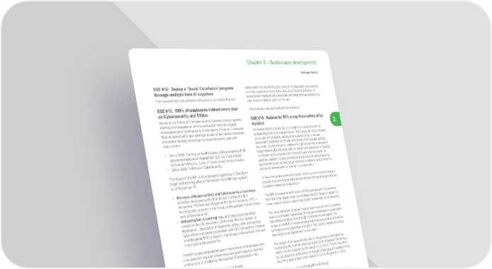 213 Life Is On | Schneider Electric www.se.com Chapter 2 – Sustainable development Strategic Report 2. SSE #12: Deploy a ‘Social Excellence’ program through multiple tiers of suppliers This indicator has not yet been deployed by Schneider Electric. SSE #13: 100% of employees trained every year on Cybersecurity and Ethics As per to our Ethics & Compliance and Cybersecurity programs, training of employees on ethics, corruption risks (for eligible employees) and cybersecurity is mandatory. To do so, Schneider Electric launched 3 new trainings as part of the Global Schneider Essentials training campaign reconducted every year with new content: • Since 2018: Training on the Principles of Responsibility (PoR document replaced in September 2021 by Trust Charter Schneider’s Electric Code of Conduct) and Anticorruption. • Since 2020: Training on Cybersecurity. The scope of this KPI is all employees registered in TalentLink (legal entities integrated in Talent Link, Core HR data system) as of November 15: • Principle of Responsibility and Cybersecurity e-learnings: all active employees with Open Ended Contracts (OEC) (exception: Chinese and Bulgarian Fix Term Contracts – FTC – are included), present in the Group on December 31st and hired before December 1st • Anticorruption e-learning : exposed employees identified based on the job description (Schneider Electric System of Reference – description of functions), active, with connectivity type online-corporate credentials, with OEC (exception: Chinese and Bulgarian FTC) present in the Group on December 31st and hired before December 1st This KPI is calculated as followed: the number of employees who completed all required e-learnings assigned based on defined criteria (2 or 3) divided by the number of employees x 100. This indicator was audited by Ernst & Young. SSE #14: 0.38 or below Medical Incident rate Safety is one of the 5 pillars of Schneider Trust Charter, which emphasizes the importance Schneider Electric is placing on its employees, customers, and contractors. Schneider works with many VIP global customers, and they demand the highest standards of Health & Safety management and performance before they engage and continue to do business with Schneider Electric. Moreover, at Schneider Electric our mission is to protect Occupational Health and Safety of employees, customers, contractors, and visitors to our locations. The Group also strives to provide employees safe, pleasant, and efficient workplaces for enhanced wellbeing and effectiveness. As such, we aim to reduce the Medical Incident Rate (MIR) to 0.38 by 2025. The MIR is the number of work incidents requiring medical treatment per million hours worked (i.e. average hours of 500 employees working for one calendar year). Work related injuries and occupational illnesses requiring medical treatment are included. Work incidents may or may not have resulted in time off work. All work-related incidents reported on Schneider Electric sites are counted (including therefore incidents affecting Schneider employees and other employees working under the supervision of Schneider, i.e. temporary workers). All Schneider sites within scope are considered. Medical incidents do not include: visits to a physician or other licensed healthcare professional solely for observation or counselling; the conduct of diagnostic procedures, such as x-rays and blood tests, including the administration of prescription medications used solely for diagnostic purposes (e.g. eye drops to dilate pupils); or first aid. This indicator was audited by Ernst & Young. SSE #15: Reduce by 50% scrap from safety units recalled Schneider Electric’s priority is to delight its customers with an outstanding end-to-end experience. The Group strives to ensure our products’ reliability, safety and cybersecurity to secure customers’ business continuity and protect their people, assets and data. Quality is every customer’s right and every employee’s responsibility. By rationale, with an enhanced emphasis on quality, Schneider products henceforth should have minimal recall. In addition, safety in using Schneider products is of utmost priority and therefore we set this target with the mindset to ensure that our products remain safe for use for our customers. In the unfortunate event of a recall, the Group aims to encourage a circular economy by reusing any parts from the recalled product as possible instead of scrapping it. This KPI is based on all Problem (PRB) opened with Go decision from the Offer Safety Alert Committee (OSAC). Target of weight of scrap need to be included in the OSAC presentation and decision. The used definition of ‘recall’ is a product recalled from Customer sites to Schneider’s premises. Products remediated at customer’s site without physical recall to SE’s premises is excluded. The scope of this KPI includes all physical products sold by Schneider. Software are by definition excluded. Also, safety recalls bound by Non-Disclosure Agreement is excluded. The weight of scrapped materials (in kilograms) is estimated by multiplying the number of physical products scrapped following a safety recall multiplied by the weight of product. The % reduction is calculated by comparing the weight of scrapped materials in the reporting year to that of the baseline (4,202 kilograms in 2020). This indicator was audited by Ernst & Young. SSE #16: In the Top 25% in external ratings for Cybersecurity performance Schneider Electric is continuously and consistently monitoring the security of its digital footprint with the support of cyber scoring agencies and this discipline is applied across the extended ecosystem* (e.g. integrated and non-integrated entities). Our primary scoring agency is BitSight which rates company security maturity between 300 to 820. This rating is calculated in real time with a proprietary algorithm that examines two classes of externally observable data: • configuration inf