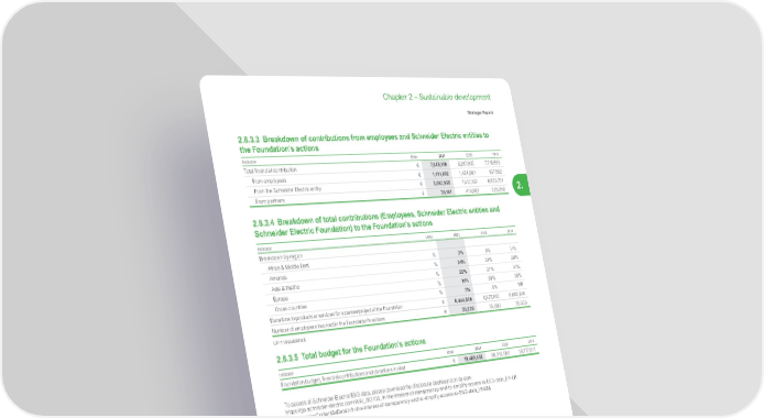 241 Life Is On | Schneider Electric www.se.com Chapter 2 – Sustainable development Strategic Report 2. 2.8.3.3 Breakdown of contributions from employees and Schneider Electric entities to the Foundation’s actions Indicator Units 2021 2020 2019 Total financial contribution € 7,0 4 5 ,15 8 9,287,805 7,715 , 6 6 3 From employees € 1,121,092 1,454,801 827,682 From the Schneider Electric entity € 5,893,925 7, 413 ,10 2 6,659,701 From partners € 3 0,141 419,9 02 228,280 2.8.3.4 Breakdown of total contributions (Employees, Schneider Electric entities and Schneider Electric Foundation) to the Foundation’s actions Indicator Units 2021 2020 2019 Breakdown by region Africa & Middle East % 3% 8% 11% America % 34% 31% 38% Asia & Pacific % 29% 27% 21% Europe % 31% 30% 30% Cross countries % 3% 4% UP Donations in products or services for a partner/project of the Foundation € 8,444,800 6 , 9 2 7,70 0 8,062,248 Number of employees involved in the Foundation’s actions # 35,000 35,000 35,000 UP = Unpublished. 2.8.3.5 Total budget for the Foundation’s actions Indicator Units 2021 2020 2019 Foundation budget, financial contributions and donations in kind € 19,489,958 20,215,505 19,777,911 To access all Schneider Electric ESG data, please download the disclosure dashboard on se.com: https://go.schneider-electric.com/WW_202105_In-the-interest-of-transparency-and-to-simplify-access-to-ESG-data_EA-LP. html?source=Content&sDetail=In-the-interest-of-transparency-and-to-simplify-access-to-ESG-data_WW&&