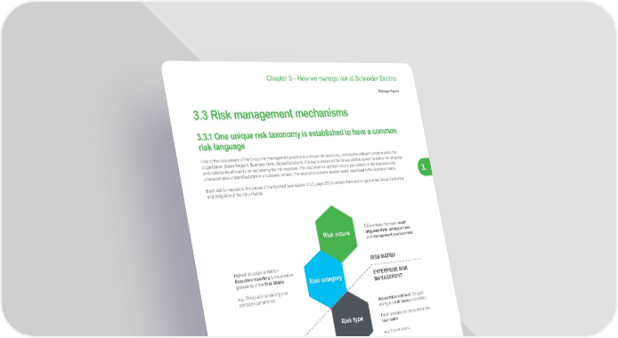 249 Life Is On | Schneider Electric www.se.com Chapter 3 – How we manage risk at Schneider Electric Strategic Report 3. 3.3 Risk management mechanisms 3.3.1 One unique risk taxonomy is established to have a common risk language One of the core assets of the Group risk management practice is a unique risk taxonomy, used by the different domains within the organization (Sales Regions, Business Units, Global Functions). It is key to ensure all the Group entities speak the same risk language and collaborate efficiently on decreasing the risk exposure. This document is updated once a year based on the relevance and characteristics of identified risks in a business context. The taxonomy contains several levels, described in the illustration below. Each risk is mapped to the pieces of the flywheel (see section 3.3.3, page 251) to ensure there are no gaps in the Group monitoring and mitigation of the risk universe. Highest structure of risk for Executive reporting & visualization granularity of the Risk Matrix e.g. Third party screening and sanctions compliance Operational risk level , managed by the domain/function in charge of the risk e.g. Supplies from countries under sanction Differentiation between event triggered risks , strategic risks and management practice risks Accountable risk level : for each risk type a risk owner is identified Detail available on risk zooms in the risk matrix e.g. Export control RISK MATRIX ENTERPRISE RISK MANAGEMENT Risk nature Risk type Risk category Risk vector Figure 2: Risk taxonomy structure