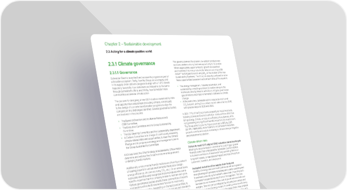 www.se.com Schneider Electric Universal Registration Document 2021 128 Chapter 2 – Sustainable development 2.3 Acting for a climate positive world 2.3.1 Climate governance 2 . 3 .1.1 G ove r n a n c e Schneider Electric sees itself and reviews its progress as part of a broader ecosystem: firstly, how the Group as a company and in its supply chain delivers progress to align with a 1.5°C climate trajectory; secondly, how customers are helped to do the same through Schneider’s offers; and thirdly, how Schneider helps communities accelerate climate action. The process for designing a new SSI includes a sustainability risks and opportunities assessment (including climate), which leads to the design of concrete transformation programs to align the company on the challenges identified. Several governance bodies are involved in this process: • The Board of Directors and its Human Resources & CSR Committee; • The Executive Committee and its Group Sustainability Committee; • The SSI Steering Committee and the Sustainability department. • A Carbon Committee is in charge of continuously assessing climate-related risks and opportunities, to steer the Climate Pledge and to propose a strategy and management plan to the Group Sustainability Committee. At Group level, the Chief Strategy & Sustainability Officer helps determine and enforce the Group’s environmental goals and underlying transformations. Additionally, environmental transformations are driven by a network of leading experts in various environmental fields (eco-design, energy efficiency, circular economy, CO 2 , etc.). On an annual basis, a process identifies and recognizes those individuals who own a specific expertise that the company is keen to maintain and grow. Various governance bodies enable these communities of experts and leaders within the Environmental function to meet every month or every quarter, depending on the topics and entities, to ensure consistent adoption of Environment policies and standards throughout the Group. To implement these policies, Environment leaders coordinate a network of more than 600 managers responsible for the environmental management of sites, countries, product design and marketing. 2.3.1.2 Risks and opportunities Climate-driven opportunities While the climate crisis is sobering, it is also stimulating significant action and innovation across businesses, industries, and governments. The combined challenge of the COVID-19 virus with increasing climate-related impacts has given rise to unprecedented financial flows for recovery tied to improvements in efficiency and emissions reduction, such as the EU’s Green Taxonomy and the US infrastructure package. Increasing awareness of the risks posed by climate change has also led thousands of businesses to make commitments to and act on decarbonization, energy efficiency, electrification, renewable energy procurement, and more. These existing solutions are only the beginning: the next decade will showcase the surge in “clean technologies,” as entrepreneurs and corporations alike seek to imagine, realize and scale innovations in energy storage, carbon capture, nature-based solutions among others, further stimulating the global economy and creating a new class of clean, green jobs. This growing demand for greener, low-carbon products and services creates a strong business opportunity for Schneider. Where appropriate, opportunities for growth are identified and translated into new products (for instance our unique SM A ir SeT ™ switchgear to avoid using SF 6 , or the creation of the new Sustainability Business). The Group is uniquely positioned to seize these opportunities because it acts on both sides of the equation: • The energy management, industrial automation, and sustainability consulting solutions Schneider brings to the market are directly linked to activities to mitigate greenhouse gas emissions and improve humanity’s resilience to climate change. • At the same time, Schneider acts to reduce its end-to-end CO 2 footprint, aiming for a carbon neutral value chain by 2040, with precise steps for 2025 and 2030. In 2021, 71% of the Group revenues qualify as Impact revenues, following Schneider Electric’s definition: revenues from offers that bring energy, climate, or resource efficiency to customers, while not generating any significant harmful impacts to the environment. The Group aims to grow its Impact revenues to 80% by 2025 (SSI #1). Additionally, more than 90% of Schneider’s innovation projects contribute to solutions relating to climate change mitigation and environment protection. Climate-driven risks Failure to meet 1.5°C-aligned GHG reduction emissions targets Missing its decarbonization commitments could trigger greater financial costs than anticipated for Schneider due for instance to locked-in emissions of assets with long operating lifetime or long-term leases, or reputational impacts and loss of trust from customers, investors, and employees. Inadapted evolution of the supply chain footprint Volatility of energy and commodity prices as well as regulation strengthening will generate increasing and volatile operating and investment costs along Schneider’s value chain, impacting both Schneider’s expenditures and those of its suppliers. This can translate into an increase of the cost of goods sold and reduced margins. This risk can be mitigated by securing low-carbon and resilient sources of energy supply, increasing resource-efficiency, and increasing resale prices along the value chain. Also, physical assets are retrofitted for resource-efficiency, as competition with newly built efficient infrastructure will increase. For instance, energy-efficient and digital buildings provide superior comfort to users while lowering operating costs, which translates into higher asset value.