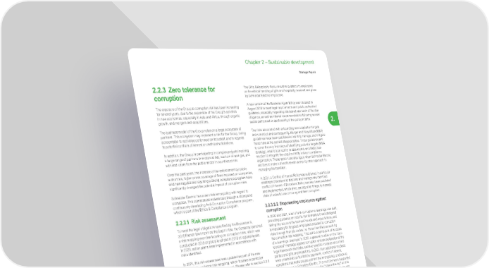 101 Life Is On | Schneider Electric www.se.com Chapter 2 – Sustainable development Strategic Report 2. 2.2.3 Zero tolerance for corruption The exposure of the Group to corruption risk has been increasing for several years, due to the expansion of the Group’s activities in new economies, especially in Asia and Africa, through organic growth, and mergers and acquisitions. The business model of the Group relies on a large ecosystem of partners. This ecosystem may represent a risk for the Group, being accountable for activities performed on its behalf, and in regards to potential conflicts of interest or unethical solicitations. In addition, the Group is participating in complex projects involving a large range of partners in sectors at risk, such as oil and gas, and with end-users from the public sector in countries at risk. Over the past years, the increase of law enforcement by public authorities, higher press coverage of fines imposed on companies, and new regulations requiring a strong compliance program have significantly changed the potential impact of corruption risks. Schneider Electric has a zero tolerance policy with regard to corruption. This commitment materialized through a strong and continuously developing Anti-Corruption Compliance program, which is part of the Ethics & Compliance program. 2.2.3.1 Risk assessment To meet the legal obligations specified by the December 9, 2016 French law known as the Sapin II law, the Company launched a risk mapping exercise focusing on corruption risks, which was conducted in 2018 at global level and in 2019 at regional levels. In 2020, action plans were implemented in accordance with risks identified. In 2021, this risk assessment was updated as part of the new Ethics & Compliance risk mapping, which focuses in particular on Corruption and Conflicts of Interest. Please refer to section 2.2.2 “Ethics & Compliance program”, page 95. 2.2.3.2 Risk management 2.2.3.2.1 Anti-Corruption framework As stated in our Trust Charter and Anti-Corruption Policy, Schneider Electric is committed to comply with all applicable laws and regulations, such as the OECD’s Convention on Combating Bribery of Foreign Public Officials in International Business Transactions, the US Foreign Corrupt Practices Act (FCPA), the UK Bribery Act, and the French Sapin II law. Schneider Electric applies a zero-tolerance policy towards corruption and other unethical business practices and considers that “doing things right” is a key value-creation driver for all its stakeholders. We count on our employees and third parties to promote business integrity. For doing so, we must provide them with the tools to encourage them to act right. In order to meet the requirements of the French Sapin II law, the Group released an Anti-Corruption Policy. The Policy was reviewed in November 2019 to take into account results of the corruption risk mapping and to provide employees with examples illustrating situations they may face. The Anti-Corruption Policy shall serve as a handbook that anyone may consult when having doubts about appropriate business practices. It is not intended to address every issue one may encounter, but it provides appropriate examples of corruption risks and offers guidance to resolve many ethical dilemmas. The Gifts & Hospitality Policy provides guidance to employees on the ethical handling of gifts and hospitality received and given by Schneider Electric employees. A new version of the Business Agent Policy was released in August 2019 to meet legal requirements and public authorities’ guidance, especially regarding risk-based approach of the due diligence, as well as internal recommendations following several audits performed on applicability of the policy in 2018. The risks associated with onboarding new acquisition targets are numerous and consequently, Merger and Acquisition (M&A) guidelines have been published to identify, manage, and mitigate those risks at the earliest stage possible. These guidelines aim to cover the very first steps of identifying potential targets (M&A strategy), what to look out for in data-rooms, and finally how we plan to integrate the acquired entity into our compliance organization. These same rules also apply when Schneider Electric decides to make a divestiture with a step-by-step approach to managing the transition. In 2021, a Conflict of Interest Policy was published, in particular creating a procedure to disclose and manage any identified conflict of interest. A Donations Policy has also been published and implemented, which aims, among other things, to manage risks of unlawful use of money and then corruption. 2.2.3.2.2 Empowering employees against corruption In 2020 and 2021, a set of anti-corruption e-learnings was built, providing guidance on real life risk scenarios; it was designed taking into account the trainees’ needs and expectations, and is mandatory for targeted employees exposed to corruption risks through their job codes, i.e. those identified as such by the corruption risk mapping. This led to a curriculum of modules of e-learnings, deployed in 2020: a general module on the “zero tolerance” message against corruption and an explanation of the legal framework and risks, and two specific modules about third parties and gifts and invitations. In 2021, four additional modules were created about facilitation payments, conflict of interest, conditions that make people commit the wrongdoing, and how to raise concerns in Schneider Electric. The modules were supported by top leaders’ videos demonstrating the “tone at the top” on this crucial matter and are available in 14 languages. In 2021, the set of anti-corruption e-learnings has been assigned to more than 40,000 employees and 97% completed it. 2.2.3.3 Focus on responsible lobbying, political activity, and donations In its Trust Charter, Schneider Electric takes a clear stance with regards to responsible lobbying, political activity, and donations