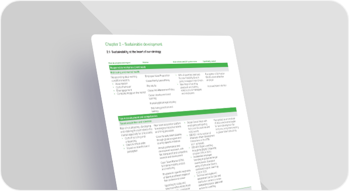 www.se.com Schneider Electric Universal Registration Document 2021 88 Chapter 2 – Sustainable development Risk description and impact Policies Main actions and 2021 performance Opportunity created Responsible workplace (continued) Well-being and mental health Not providing ideal working conditions leads to • Absenteeism • Cost of turnover • Disengagement • Company image on the market Employee Value Proposition Global Family Leave Policy Pay equity Global Anti-Harassment Policy Career development and learning Flexibility@Work hybrid policy Well-being practices and training • 99% of countries deployed the new flexibility @ work policy to support hybrid work. • New Ways of working playbook and training rolled out to all managers and employees Recognition of Schneider Electric as an attractive employer Improved talent retention Talent development and competencies Talent acquisition and retention Risk of not attracting, developing, and retaining the best talent in the market especially for critical skills • Cost of recruiting and onboarding • Gaps in critical skills • Impact on talent’s brand perception New talent acquisition platform to manage prospective talents and hiring processes Grow the early talent pipeline through global program and country-specific initiatives Annual performance and development approach, with fair, transparent and competitive rewards and development Open Talent Market (OTM) for internal mobility, project and mentoring Programs for specific segments of talents at different stages of their professional career Upskilling for today and tomorrow with a strong focus on digital skills, commercial excellence, leadership and functional expertise • Global Career Week with employees participating from over 90 countries and >250 events • SSE #21: x4 the number of employee-driven development interactions on the OTM (x 2.1 a c h i e v e d ) • SSE #22: Digital upskilling through the Digital Citizenship program (74% in 2021) • Accelerated employee branding at global and target country levels; Glassdoor rating of Schneider Electric continued to grow, reaching 4.2/5 in 2021 • Technical and digital skill assessment tool for GSC and distribution centers to review competency levels, gaps and actions for upskilling Recognized as an employer of choice and market leader for talent development for everyone, everywhere leading to greater talent attractivity Rewards, benefits and engagement Risk of having disengaged employees feeling that their opinion is not valued: • Impact the financial results of the Group • Difficulty to retain talent Embed a culture of continuous listening, recognition, and ongoing feedback to drive engagement and performance • A global annual survey covers 100% of Group employees with additional focus on action planning, including a nudge and peer to peer session for managers, deeper verbatim analysis; design and launch of pulse survey targeting populations for whom attention is needed (newly acquired entities, entities undergoing change projects). • SSE #24: 75% Employee Engagement Index (71% achieved) Greater employee performance, brand image and loyalty Ensure that the group maintains its position of attractive employer 2.1 Sustainability at the heart of our strategy
