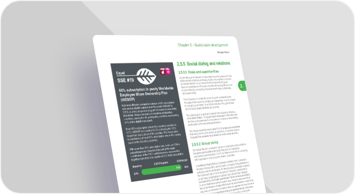 185 Life Is On | Schneider Electric www.se.com Chapter 2 – Sustainable development Strategic Report 2. 60% subscription in yearly Worldwide Employee Share Ownership Plan (WESOP) Schneider Electric commits to achieve a 60% subscription rate among eligible employees in the yearly WESOP by 2025, as a key program to support Schneider Sustainability Essentials. Scope concerns 29 recurring participating countries, among the 40 participating countries representing 91% of the eligible headcount. From 53% subscription rate in the recurring countries in 2019, WESOP has reached 60.5% achieving the 2025 target four years ahead of the deadline. The Group aims to maintaining at least 60% subscription rate in the coming years in the recurring countries. With more than 80% subscription rate, India, and China outperformed and have become part of the major contributors of the 2021 capital increase, representing together more than one-quarter of 2021 total subscription. Equal SSE #19 60% 53% Baseline 2025 target 2021 Progress 0 100 61% 2.5.5 Social dialog and relations 2.5.5.1 Risks and opportunities Social dialog and freedom of association must be seen within the wider context of ethics and responsibility. As a global Company, Schneider Electric is convinced that its responsibility goes beyond compliance with local and international regulations and is committed to conducting its business ethically, sustainably, and responsibly. The Company is constantly interacting with all stakeholders throughout the world: its borders are expanding, its environment is changing ever faster, its activities are becoming globalized, and its social responsibilities are growing. The challenge is to gain and maintain the highest confidence of its stakeholders. To support each employee in this approach, the Group emphasizes the importance of placing responsibility at the heart of its corporate governance. The Group currently has around 128,000 employees worldwide. Following the Group’s various acquisitions, it has been able to integrate this exceptional professional and cultural diversity. 2.5.5.2 Group policy Schneider Electric considers freedom of association and collective bargaining as fundamental rights that must be respected everywhere and therefore in its Trust Charter commits to complying with local laws in every country where it operates. In its Human Rights Policy, Schneider confirms that it considers freedom of association as the basis of a regular dialog between a company and its employees. To that purpose, Schneider respects the individual right of its employees to freely join, participate in, or quit labor organizations to assert and defend their interests. Subsequently, Schneider guarantees that any employee wishing to do so shall be protected against any internal measure limiting his or her freedom of association such as discrimination of any kind, pay loss, or dismissal. Schneider also recognizes the importance of dialog with freely appointed employee representatives, employee representative bodies (such as Works Councils or employee forums), or organizations (like trade unions) and supports collective bargaining. In addition, Schneider joined the Global Deal initiative in 2017. The Group is promoting social dialog as a means to foster decent work, quality jobs, increased productivity and, by extension, greater equality and inclusive growth.