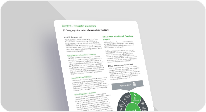 www.se.com Schneider Electric Universal Registration Document 2021 96 Chapter 2 – Sustainable development 2.2 Driving responsible conduct of business with the Trust Charter 2.2.2.1.2 Corporate level The Group Ethics & Compliance Committee is assisted by the Group Operational Compliance Committee (GOCC) and the Group Disciplinary Committee, which both ensure effectiveness of the speak-up culture (a culture in which employees feel free and psychologically safe to share their ideas, opinions, and concerns, without fear of retaliation) and whistleblowing system, and fair and transparent disciplinary policy. Group Operational Compliance Committee The GOCC detects and manages cases of non-compliance with the Ethics & Compliance program in accordance with the Group Case Management & Investigation Policy released in February 2020 and updated in October 2021, and reviews monthly the effectiveness of the whistleblowing system. The GOCC is composed of the following members: Chief Compliance Officer (secretary of the Committee), Chief Legal Officer, Group Internal Audit & Control Officer, Group Compliance Director, Group HR Compliance Officer, and Head of Fraud Examination Team. Group Disciplinary Committee The Group Disciplinary Committee is in charge of levying sanctions and remediation actions on serious non-compliance cases upon request of the GOCC. The Group Disciplinary Committee is composed of the following members: Chief Governance Officer, Chief Human Resources Officer, Chief Compliance Officer (secretary of the Committee), Chief Legal Officer, and one rotating member. Ethics & Compliance department Schneider Electric has also created a standalone Ethics & Compliance department, chaired by a dedicated Chief Compliance Officer acting on behalf of the Group Ethics & Compliance Committee, and reporting to the Chief Governance Officer, to drive the strategy on the Ethics & Compliance program. The Ethics & Compliance department includes the following teams: Group Compliance, Group HR Compliance, Health & Safety, Fraud Examination, IT Assets Governance, Policy Management, Business Continuity Planning and Digital Transformation for Ethics & Compliance. It works closely with the Legal, Human Resources, Finance, and Strategy & Sustainability departments, as well as Internal Control and Audit. This cross-functional and integrated approach is central to the program’s effectiveness. 2.2.2.1.3 Operational level by geographic zone Regional Ethics & Compliance committees ensure implementation of the Ethics & Compliance program in alignment with risks identified. Operationally, they rely on Regional Compliance Officers who drive the implementation in the zone, with the support of Ethics Delegates and relevant subject matter experts at local levels. 2.2.2.2 Pillars of the Ethics & Compliance program All Schneider Electric employees are expected to comply with Schneider’s Ethics & Compliance program. Its daily application helps them to act with integrity and transparency, and to comply with all international and local regulations. The Ethics & Compliance program is based on management commitment (called “tone from the top”), which makes its pillars effective. Top management sets the Ethics & Compliance standards and promotes a culture of integrity throughout the Group and its operations. In addition, middle management walks the talk by complying with rules, spreading the right message in their teams, and supports reporting of misconducts. 2.2.2.2.1 Risk assessment at Zone level In 2021, Schneider Electric carried out specific risk mapping dedicated to “Ethics and Compliance” risks on the following risks: Corruption, Conflict of Interest, Human Rights & Labor Laws, and Sanctions & Export Control. The objective of this “Ethics and Compliance” risk mapping is to capture operational risk exposure at zone level, based on local interviews led by the Regional Compliance Officers and the Legal teams. Ethics & Compliance Pillars Code of conduct & Policies Training & Awareness Third parties compliance Specific accounting controls Whistle blowing Disciplinary measures Monitoring & Audit Risk Assessment Tone from the top The process at regional level was as follow: • step 1 – each region defined its local risk universe taking into account local specific risks, • step 2 – each region assessed its gross risks and effectiveness of its local mitigation measures, generating a mapping of regional net risks, and • step 3 – each region defined action plans (validated by the respective regional Ethics & Compliance committees) to reduce the risk exposure. In addition, a global gross and net risks mapping was consolidated at Group level, as well as a set of action plans to be taken at global level. All action plans will be monitored during the course of 2022.