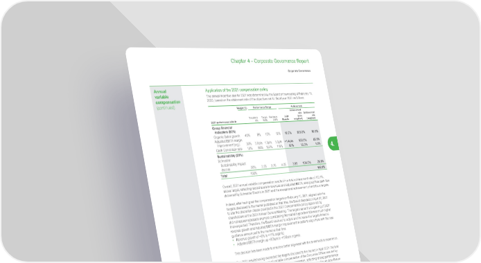 317 Life Is On | Schneider Electric www.se.com Chapter 4 – Corporate Governance Report Corporate Governance 4. Annual variable compensation (continued) Application of the 2021 compensation policy The annual incentive due for 2021 was determined by the Board at the meeting of February 16, 2022, based on the attainment rate of the objectives set for fiscal year 2021 as follows: Weight (%) Performance Range Achievement 2021 performance criteria Threshold 0% Target 100% Maximum 200% 2021 Results Achievement rate (non- weighted) Achievement rate (weighted) Group financial indicators (80%) Organic Sales growth 40% 8% 10% 12% 12.7% 200.0% 80.0% Adjusted EBITA margin improvement (org.) 30% 0.9pts 1.3pts 1.5pts +1.4pts 150.0% 45.0% Cash Conversion rate 10% 85% 100% 115% 87% 13.3% 1.3% Sustainability (20%) Schneider Sustainability Impact (score) 20% 3.25 3.75 4.25 3.92 134.0% 26.8% Total 100% 15 3.1% Overall, 2021 annual variable compensation resulted in a total achievement rate of 153.1%, above target, reflecting record levels in revenues and adjusted EBITA, and good free cash-flow delivered by Schneider Electric in 2021 and the exceptional achievement of ambitious targets. Indeed, after having set the compensation targets on February 10, 2021, aligned with the targets disclosed to the market published at that time, the Board decided on April 27, 2021 to use the discretion clause provided in the 2021 Compensation policy approved by shareholders at the 2021 Annual General Meeting. The targets set at the beginning of 2021 did not appear adequate anymore considering the market’s growth which was much higher than expected. Therefore, the Board resolved to adjust and increase the targets linked to revenue growth and Adjusted EBITA margin improvement in order to align them with the new guidance announced to the market at that time: • Revenue growth of +8% to +11% organic; • Adjusted EBITA margin up +90bps to +130bps organic. This decision has been made to ensure a better alignment with the shareholders experience. The 2021 results having exceeded the targets disclosed to the market in April 2021, the total achievement rate of the annual variable compensation of the Corporate Officer was set by the Board at 153.1% of the targeted variable compensation, reflecting strong performance of Schneider Electric in 2021 as was also reflected in the excellent Total Shareholder Return of Schneider Electric. When the targets disclosed to the market were, once again, upgraded in July 2021, the Board resolved not to review the compensation targets as it was considered that this new guidance could not anymore be attributed to external factors, such as improved market conditions, but was instead linked to the company’s intrinsic performance. Detailed achievement of each criterion: • Organic Sales growth: The Group delivered an organic sales growth of +12.7%, which was above the guidance communicated to the market in April 2021 of +8% to +11%. Therefore, this good performance resulted in the maximum achievement rate of this criterion, i.e., 80% on the range between 0% to 80%. • Adjusted EBITA margin improvement: In 2021, Adjusted EBITA margin rate improved by +140bps organically to reach 17.3%, thanks to a combination of strong top line performance, pricing actions and productivity. This performance is above the guidance objective of +90bps to +130bps communicated to the market in April 2021. As a result, the achievement rate on this criterion is set at 45% on a scale from 0% to 60%. • Cash conversion: free cash-flow was €2.8bn with operating cash flow impacted by working capital requirements, as trade receivables rebounded and inventory increased both as a consequence of the strong external demand environment, and the supply chain pressures (some components shortages leading to higher safety stocks). Therefore, cash conversion was only 87% in 2021 which represented an achievement rate of 1.3% on this criterion, on a scale from 0% to 20%.