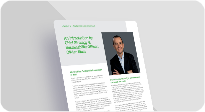 www.se.com Schneider Electric Universal Registration Document 2021 60 Chapter 2 – Sustainable development World’s Most Sustainable Corporation in 2021 For well over a decade, sustainability has been at the heart of what Schneider does. Still, 2021 was a standout year, in several respects. In January, our continuous efforts to address climate change and social inequality received the highest profile of external recognitions when the Canadian media and research company Corporate Knights ranked us the World’s Most Sustainable Corporation. This, along with numerous other ESG recognitions in 2021, is testimony to the valuable, long-term positive impact we have. Throughout the year, the need to address climate change and social inequality hit headlines seemingly every day. In November, governments and businesses made important commitments at the COP26 climate change conference, though talk must now translate into rapid, bold and comprehensive action if we’re to prevent a potentially catastrophic rise in global temperatures. We share the responsibility to act with governments and other institutions, and we believe that private-sector corporates like Schneider play a crucial role in leading the transition to a cleaner, more inclusive world. Paving the way as an Impact Company As an Impact company, we’re determined to keep intensifying our meaningful and lasting impact across all dimensions of ESG (environmental, social, corporate governance and ethics), from employees to supply chain partners, customers, as well as local communities and institutions at local and global levels. By weaving sustainability and societal impact into all facets of our business, we create long-term value for all stakeholders and deliver profitable growth. During the course of the year, we moved forward with our 2021- 2025 Schneider Sustainability Impact (SSI) targets. These are aligned to both our six long-term commitments related to climate, resources, equal opportunities, trust, all generations, and local communities, and to the United Nations’ Sustainable Development Goals. This latest program reinforces our ESG commitments through 11 global targets, plus a new local target to empower our country organizations to address their specific challenges and opportunities. The progress we make on these SSI targets is a true indicator of our company’s transformation, both globally and on the ground. Our achievements to fight climate change and social inequality In the first quarter of 2021, we kicked off a new initiative to help 1,000 of our top suppliers reduce their carbon emissions by 50% by 2025. With our supply chain community, we’re working to evaluate, strategize and implement decarbonization actions suited to each supplier’s specific maturity and scope. Furthermore, we’ve raised our ambitions when it comes to the environmental and social responsibility of our supply chain: we are well on our way to using more sustainable resources and materials in our products and packaging, and we audit our suppliers to ensure they comply with the highest ethical work standards and best practices. As ever, we’re committed to helping resolve social problems, and to promoting equal opportunities for all our employees. We live in a world for instance where 800 million people don’t have access to energy, which is why we develop and deliver adapted solutions that supply clean, safe and reliable energy, hereby unlocking education and economic opportunity, and a better quality of life. We also continue to prioritize learning, development and upskilling not only for Schneider’s multi-generational workforce, but also through the work of the Schneider Electric Foundation in supporting local NGOs that run vocational training programs for young people. In 2021, we reached an impressive milestone in this field, with 300,000 people trained in energy management since we launched the program in 2009. And no less importantly, we seek to build trust with our stakeholders, living up to the highest standards of corporate governance, through initiatives that monitor and educate teams on ethics, cybersecurity, safety, and quality. Our 2021 Trust Charter, the evolution of our Principles of Responsibility, sets out the expectations of how we work at Schneider, and equips our teams to confront any unethical behavior they might encounter. These are just some highlights of 2021. Looking ahead, as a leading Impact Company in 2022, we’re committed to doing even more, even faster. Read more about our performance on page 63 An introduction by Chief Strategy & Sustainability Officer, Olivier Blum