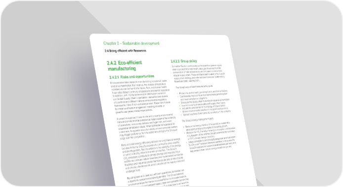 www.se.com Schneider Electric Universal Registration Document 2021 150 Chapter 2 – Sustainable development 2.4 Being efficient with Resources 2.4.2 Eco-efficient manufacturing 2.4.2.1 Risks and opportunities Environmental risks related to manufacturing include soil, water, and air contamination. For instance, the release of hazardous substances can be harmful for fauna, flora, and human health. It can also disrupt continuity of operations and tarnish reputation. In addition, with 183 factories and 94 distribution centers in our Global Supply Chain organization, spread across dozens of countries and different national environmental regulatory frameworks, risks of non-compliance exist. These risks include for instance effluent management, handling of waste, or greenhouse gases related expectations. A proactive approach towards site and property environmental risks and environmental compliance helps preserve the continuity of operations, reduce reputational and legal risks, and avoid expensive remediation steps. When Schneider runs projects for customers, its superior execution ability on environmental matters may trigger preference from its customers and give the Group an edge over the competition. Resource and energy efficiency delivers not only financial savings, but also limits the Group’s exposure to commodity-price volatility and shortage risks. The risk extends to the reliability of the energy on which a facility relies to maintain production. The Group’s CO 2 emissions contribute to climate change and may also incur additional costs as carbon taxes become implemented worldwide. Facilities and industrial assets themselves are also at risk of acute and chronic climate events which can disrupt the supply chain and endanger lives. By using lean and clean eco-efficient operations, Schneider can outperform competitors and mitigate risks. The Group believes environmental performance is a powerful tool to innovate towards a more efficient and resilient supply chain and generate bottom-line savings. By using its own EcoStruxure ™ architecture to achieve this ambition, the Group also showcases carbon efficient architectures to its customers. 2.4.2.2 Group policy Schneider Electric continuously works towards a greener supply chain to protect the environment, decouple its activity from the consumption of natural resources, and innovate to build a more circular supply chain. These ambitions are included in the Group’s supply chain strategy, and referred to as Schneider Sustainability Essentials (SSE), starting 2021. The Group’s eco-efficient manufacturing goals: • Protect the environment, prevent pollution, and limit emissions; • Continuously improve the environmental management system and meet compliance obligations; • Decouple the supply chain from natural resource consumption; • Invent circular business models and supply chain loops; • Include the environment in its strategy and governance; • Extend environmental ambitions to suppliers and partners; • Spread a culture of environmental excellence in the company. The Group’s energy management goals: • Reduce the energy intensity of its operations, sustainably decoupling energy consumption from activity growth; • Reduce the CO 2 intensity of energy consumption, and absolute CO 2 footprint, in line with the Group’s commitments to achieve a 1.5°C climate change trajectory; • Adopt Schneider’s own Energy Management and Automation EcoStruxure ™ solutions wherever possible, to showcase the Group’s solutions for customers and business partners, and help embark them onto an energy excellence journey. Schneider Electric 2025 sustainable supply chain ambitions 0 fatal and serious accident 100% of applicable sites certified with ISO 14001, ISO 50001 and ISO 45001 150 Zero-CO 2 sites 90% of electricity comes from renewable sources 100% of sites deliver energy savings, with EcoStruxure ™ Power and EcoStruxure ™ Resource Advisor Top 1,000 suppliers reduce operational CO 2 emissions by 50% 15% CO 2 efficiency in transportation 200 ‘Waste-to-Resource’ sites 100% of packaging is free from single-use plastic and uses recycled cardboard 100% sites with Circular supply chain innovations 100% sites with local biodiversity preservation programs & water efficiency Preserve life and act responsibly Act for a climate positive world Be efficient with resources