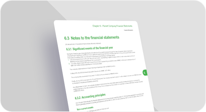 415 Life Is On | Schneider Electric www.se.com Chapter 6 – Parent Company Financial Statements Financial Statements 6. 6.3 Notes to the financial statements (All amounts are in thousands of euros unless otherwise indicated) 6.3.1 Significant events of the financial year During the financial year, Schneider Electric SE carried out (i) a capital increase through the issue of company shares reserved for employees participating in the PEG and (ii) a capital increase through the issue of shares reserved for Group employees based outside France and for entities within the framework of employee shareholding or saving programs: i. 0.55 million shares issued with a par value of 4 euros each, representing a capital increase of EUR 2.2 million and a share premium of EUR 58.5 million (shares subscribed at 110.19 euros each); ii. 1.41 million shares issued with a par value of 4 euros each, representing a capital increase of EUR 5.7 million and a share premium of EUR 150.1 million (shares subscribed at 110.19 euros each). The company redeemed a bond issue maturing in September 2021 for EUR 600 million. In May 2021, the 2020 dividend was paid in the amount of EUR 1,447 million. The company also proceeded to buy back 1.8 million of its own shares for EUR 262 million. Finally, during 2021, share plans 30, 31 and 31bis expired, the company decided to serve 2.1 million shares for an amount of EUR 124 million re-invoiced to the group companies concerned. As of December 31, 2021, the company decided to fund some of its current share plans by using existing shares and to re-invoice the related expense to the various entities of the Group. As a consequence, the provision for expenses on shares distribution has been adjusted to EUR 348 million. 6.3.2 Accounting principles As in the prior financial year, the financial statements for the financial year ended December 31, 2021 have been prepared in accordance with French generally accepted accounting principles and with the ANC no. 2014-03 code updated by ANC no. 2016-07 code on Nov. 04, 2016. Non-current assets Non-current assets of all types are stated at historical cost. Intangible assets Intangible rights are amortized over a maximum of 5 years. Property, plant and equipment Amortizable Items of property, plant and equipment are depreciated on a straight- line basis over their estimated useful lives, ranging from 3 to 10 years. Lands are not depreciated. Shares in subsidiaries and affiliates Shares in subsidiaries and affiliates are stated at acquisition cost. Provisions for impairment may be funded where the carrying amount is higher than the estimated value in use at the end of the financial year. This estimate is primarily determined on the basis of the underlying net assets, earnings outlook and economic forecasts. For listed securities, the average stock price over the month before the closing is used. Provisions may be reversed if the estimated value becomes higher than the carrying amount. Unrealized gains resulting from such estimates are not recognized.