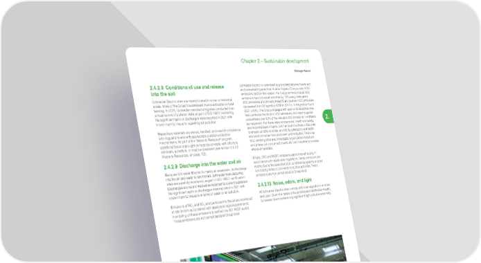 155 Life Is On | Schneider Electric www.se.com Chapter 2 – Sustainable development Strategic Report 2. 2.4.2.8 Conditions of use and release into the soil Schneider Electric sites are mainly located in urban or industrial areas. None of the Group’s businesses involve extraction or land farming. In 2021, Schneider manufacturing sites conducted their annual review of pollution risks as part of ISO 14001 monitoring. No significant spills or discharges were reported in 2021 with known harmful impacts regarding soil pollution. Hazardous materials are stored, handled, and used in compliance with regulations and with appropriate pollution protection mechanisms. As part of the ‘Waste-to-Resource’ program, additional focus is brought on hazardous waste, with efforts to eliminate, substitute, or improve treatment (see section 2.4.2.5 Waste to Resources, on page 152). 2.4.2.9 Discharge into the water and air Because Schneider Electric is mainly an assembler, its discharge into the air and water is very limited. Schneider manufacturing sites are carefully monitored, as part of ISO 14001 certification. Discharges are locally tracked as required by current legislation. No significant spills or discharges were reported in 2021 with known harmful impacts in terms of water or air pollution. Emissions of NO X and SO X and particles into the air are monitored at site level in accordance with applicable legal requirements; monitoring of these emissions is verified via ISO 14001 audits. Those emissions are not consolidated at Group level. Schneider Electric is committed to preventing adverse health and environmental impacts from Volatile Organic Compounds (VOC) emissions, and for this reason, the Group works to reduce VOC emissions from industrial activities by 10% every three years. VOC emissions are primarily linked to production. VOC emissions decreased from 29 kg/million EUR in 2017 to 17.4 kg/million Eur in 2021 (-40%). The Group engages with each of its industrial sites that contribute the most to VOC emissions, and which together concentrate over 90% of the Group’s VOC emissions, in a Pareto law approach. For these sites, environment, health and safety, and industrialization teams, join hands and actively collaborate to ensure conditions of use are strictly adhered to and health and environmental risks are known and mitigated. Those top VOC-emitting sites also investigate opportunities to reduce and phase-out concerned chemicals from industrial processes wherever possible. Finally, CFC and HCFC emissions are monitored locally, in accordance with applicable regulations. These emissions are mainly due to the operation of air conditioning systems and are not directly linked to Schneider industrial activities. These emissions are not consolidated at Group level. 2.4.2.10 Noise, odors, and light All Schneider Electric sites comply with local regulations on noise and odor. Given the nature of its activities and distribution model, Schneider does not have any significant light pollution externality.