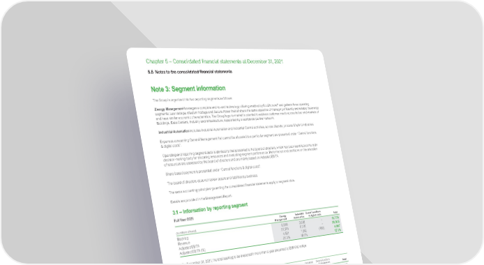www.se.com 364 Schneider Electric Universal Registration Document 2021 Chapter 5 – Consolidated financial statements at December 31, 2021 Note 3: Segment information The Group is organized into two reporting segments as follows: Energy Management leverages a complete end-to-end technology offering enabled by EcoStruxure ™ and gathers three operating segments: Low Voltage , Medium Voltage and Secure Power that all share the same objective of managing efficiently and reliably the energy and have similar economic characteristics. The Group’s go-to-market is oriented to address customer needs across its four end-markets of Buildings, Data Centers, Industry and Infrastructure, supported by a worldwide partner network. Industrial Automation includes Industrial Automation and Industrial Control activities, across discrete, process & hybrid industries. Expenses concerning General Management that cannot be allocated to a particular segment are presented under “Central functions & digital costs”. Operating and reporting segment data is identical to that presented to the board of directors, which has been identified as the main decision-making body for allocating resources and evaluating segment performance. Performance and decisions on the allocation of resources are assessed by the board of directors and are mainly based on Adjusted EBITA. Share-based payment is presented under “Central functions & digital costs”. The board of directors does not review assets and liabilities by business. The same accounting principles governing the consolidated financial statements apply to segment data. Details are provided in the Management Report. 3.1 – Information by reporting segment Full Year 2021 (in millions of euros) Energy Management Industrial Automation Central functions & digital costs Total Backlog 9,088 2,688 – 11,776 Revenue 2 2,179 6,726 – 28,905 Adjusted EBITA 4,501 1,242 (756) 4,987 Adjusted EBITA (%) 20.3% 18.5% 17. 3% On December 31, 2021, the total backlog to be executed in more than a year amounted to EUR 640 million. Full Year 2020 (in millions of euros) Energy Management Industrial Automation Central functions & digital costs Total Backlog 7, 2 31 1,765 – 8,996 Revenue 19,344 5,815 – 25 ,15 9 Adjusted EBITA 3,634 992 (700) 3,926 Adjusted EBITA (%) 18.8% 17.1% 15.6% On December 31, 2020, the total backlog to be executed in more than a year amounted to EUR 639 million. 3.2 – Information by region The geographic regions covered by the Group are: • Western Europe; • North America (including Mexico); • Asia-Pacific; • Rest of the World (Eastern Europe, Middle East, Africa, South America). Non-current assets include net goodwill, net intangible assets and net property, plant and equipment. 5.5 Notes to the consolidated financial statements