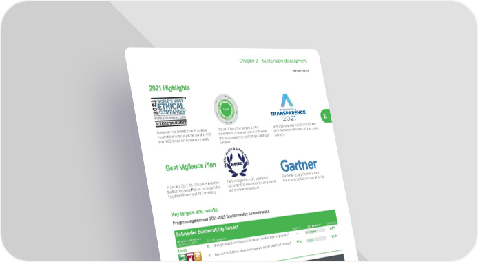 93 Life Is On | Schneider Electric www.se.com Chapter 2 – Sustainable development Strategic Report 2. 2021 Highlights TRUST T e a m s C u s t o m e r s a n d P a r t n e r s C u s t o m e r s a n d P a r t n e r s I n v e s t o r s C o m m u n i t i e s E t h i c s C y b e r s e c u r i t y S a f e t y Q u a l i t y S u s t a i n a b i l i t y Schneider was awarded the Ethisphere ‘most ethical company in the world’ in 2021 and 2022, for eleven consecutive years. The 2021 Trust Charter sets out the expectations of how we work at Schneider and equips teams to confront any unethical behavior. Schneider awarded the 2021 ‘Grand Prix de la Transparence’ in the ESG information category. Best Vigilance Plan In January 2021, the Group was awarded the Best Vigilance Plan by the Sustainable Investment Forum and A2 Consulting. Triple recognition in UK and Ireland demonstrating excellence in safety, health and environmental impact. Gartner #1 Supply Chain in Europe Our second consecutive year at the top. Key targets and results Progress against our 2021-2025 Sustainability commitments Schneider Sustainability Impact Long-term commitments aligned to UN SDGs 2021-2025 programs Baseline (1) 2021 progress (2) 2025 Target Tr ust 6. Strategic suppliers who provide decent work to their employees (3) -- In progress 100% 7. Level of confidence of our employees to report unethical conduct 81% +0pts +10pts Schneider Sustainability Essentials Long-term commitments aligned to UN SDGs 2021-2025 programs Baseline (1) 2021 progress (2) 2025 Target Tr ust 12. Deploy a ‘Social Excellence’ program through multiple tiers of suppliers (3) -- In progress -- 13. Train our employees on Cybersecurity and Ethics every year 90% 96% 100% 14. Decrease the Medical Incident rate 0.79 0.65 0.38 15. Reduce scrap from safety units recalled 4,202 4,024 2 ,101 16. Be in the Top 25% in external ratings for Cybersecurity performance Top 25% Top 25% Top 25% 17. Assess our suppliers under our ‘Vigilance Program’ 374 1,203 4,000 (1) Generally, the 2020 performance serves as a baseline for Schneider Sustainability Impact (SSI) and Schneider Sustainability Essentials (SSE) 2021-2025 programs. (2) Each year, Schneider Electric obtains a “limited” level of assurance from an independent third party verifier for all of the SSI and SSE indicators (except for SSI #6, SSI #7, SSI #+1, SSE #12 and SSE #23), in accordance with ISAE 3000 assurance standard (see Independent verifier’s report on page 224). Please refer to page 206 for the methodological presentation of each indicator. The 2021 performance is also discussed in more details in this section. (3) 2021 performance is in progress for SSI #6 Decent work and SSE #12 ‘Social Excellence’ because the programs are still in development.