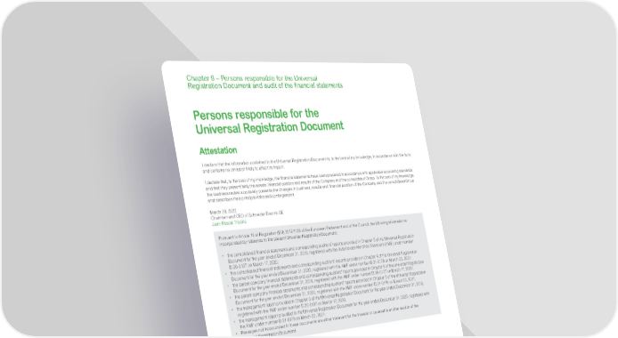 www.se.com Schneider Electric Universal Registration Document 2021 474 Chapter 9 – Persons responsible for the Universal Registration Document and audit of the financial statements Persons responsible for the Universal Registration Document Attestation I declare that the information contained in the Universal Registration Document is, to the best of my knowledge, in accordance with the facts and contains no omission likely to affect its import. I declare that, to the best of my knowledge, the financial statements have been prepared in accordance with applicable accounting standards and that they present fairly the assets, financial position and results of the Company and the consolidated Group. To the best of my knowledge, the business review accurately presents the changes in business, results and financial position of the Company and the consolidated Group and describes their principal risks and contingencies. March 29, 2022 Chairman and CEO of Schneider Electric SE Jean-Pascal Tricoire Pursuant to Article 19 of Regulation (EU) 2017/1129 of the European Parliament and of the Council, the following information is incorporated by reference in the present Universal Registration Document: • the consolidated financial statements and corresponding auditors’ reports provided in Chapter 5 of the Universal Registration Document for the year ended December 31, 2019, registered with the Autorité des Marchés Financiers (AMF) under number D.20-0137 on March 17, 2020; • the consolidated financial statements and corresponding auditors’ reports provided in Chapter 4 of the Universal Registration Document for the year ended December 31, 2020, registered with the AMF under number D.21-0178 on March 23, 2021; • the parent company financial statements and corresponding auditors’ reports provided in Chapter 6 of the Universal Registration Document for the year ended December 31, 2019, registered with the AMF under number D.20-0137 on March 17, 2020; • the parent company financial statements and corresponding auditors’ reports provided in Chapter 5 of the Universal Registration Document for the year ended December 31, 2020, registered with the AMF under number D.21-0178 on March 23, 2021; • the management report provided in Chapter 3 of the Universal Registration Document for the year ended December 31, 2019, registered with the AMF under number D.20-0137 on March 17, 2020; • the management report provided in the Universal Registration Document for the year ended December 31, 2020, registered with the AMF under number D.21-0178 on March 23, 2021; • Passages not incorporated in these documents are either irrelevant for the investor or covered in another section of the Universal Registration Document.