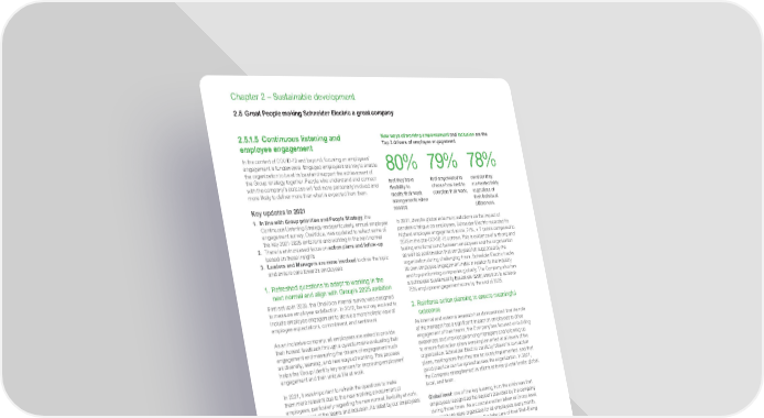www.se.com Schneider Electric Universal Registration Document 2021 168 Chapter 2 – Sustainable development 2.5 Great People making Schneider Electric a great company 2.5.1.5 Continuous listening and employee engagement In the context of COVID-19 and beyond, focusing on employees’ engagement is fundamental. Engaged employees are key to enable the organization to be at its best and support the achievement of the Group strategy together. People who understand and connect with the company’s purpose will feel more personally involved and more likely to deliver more than what is expected from them. Key updates in 2021 1. In line with Group priorities and People Strategy , the Continuous Listening Strategy and particularly, annual employee engagement survey, OneVoice, was updated to reflect some of the key 2021-2025 ambitions and working in the next normal 2. There is an increased focus on action plans and follow-up based on these insights 3. Leaders and Managers are more involved to drive the topic and ensure care towards employees 1. Refreshed questions to adapt to working in the next normal and align with Group’s 2025 ambition First set up in 2009, the OneVoice internal survey was designed to measure employee satisfaction. In 2012, the survey evolved to include employee engagement to derive a more holistic view of employee expectations, commitment, and sentiment. As an inclusive company, all employees are asked to provide their honest feedback through a questionnaire evaluating their engagement and measuring the drivers of engagement such as diversity, learning, and new ways of working. This process helps the Group identify key avenues for improving employees’ engagement and their unique life at work. In 2021, it was important to refresh the questions to make them more relevant due to the new working environment of employees, particularly regarding the new normal, flexibility at work, empowerment of the teams and inclusion. As rated by our employees: New ways of working empowerment and inclusion are the Top 3 drivers of employee engagement 80% feel they have flexibility to modify their work arrangements when needed. 79% feel empowered to choose how best to complete their work. 78% consider they are treated fairly regardless of their individual differences. In 2021, despite global external predictions on the impact of pandemic fatigue on employees, Schneider Electric recorded its highest employee engagement score, 71%, + 7 points compared to 2019 in the pre-COVID-19 context. This is evidence of a strong and lasting emotional bond between employees and the organization as well as confirmation that employees felt supported by the organization during challenging times. Schneider Electric tracks its own employee engagement index in relation to the industry and top-performing companies globally. The Company also has a Schneider Sustainability Essentials (SSE) ambition to achieve 75% employee engagement score by the end of 2025. 2. Reinforce action planning to ensure meaningful outcomes As internal and external research has demonstrated that the role of the manager has a significant impact on employees to drive engagement of their teams, the Company has focused on building awareness and knowledge among managers and following up to ensure that action plans were implemented at all levels of the organization. Schneider Electric carefully follows its own action plans, making sure that they are seriously implemented, and that good practice can be spread across the organization. In 2021, the Company strengthened its efforts at three pivotal levels: global, local, and team. Global level: one of the key learning from the crisis was that employees recognized the support provided by the company during those times. As a concrete action taken at Group level, live sessions were organized for all employees every month, aiming at learning how to better take care of their Well-Being. Local level: the financial support provided to India through Tomorrow Rising fund had a very positive impact which was raised in the comments of our OneVoice annual survey as a delightful moment. Team level: Managers still played a key role and the recognition they gave to their team members had a positive impact on their team members. One of the concrete actions taken in Victoria’s plant in the United States is to empower collaborators to come to management team with ideas for recognition events. Key highlights for 2021 100% of employees were surveyed in May 2021 through a consistent and continued measurement of the employee engagement index but with a refreshed set of questions to better fit our ambition: Participation 85% 108,904 responses Comments analyzed 13 4k Engagement 71% +2pts vs 2020 +7pts vs 2019 Managers 4,716 have access to a customized report Action plans 1,000+ recorded since July 2021