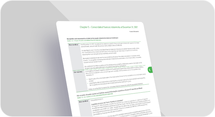 399 Life Is On | Schneider Electric www.se.com Financial Statements 5. Chapter 5 – Consolidated financial statements at December 31, 2021 Recognition and recoverability of deferred tax assets related to tax losses carried forward Notes 1.3, 1.16 and 14 to the consolidated financial statements Risk identified As at December 31, 2021, the deferred tax assets recognized in the group’s balance sheet, with regards to tax losses carried forward, amount to M€ 689 and are mainly related to France for M€ 500. As described in note 1.16 to the consolidated financial statements, the group recognizes future tax benefits, arising from the utilization of tax losses carried forward, to the extent they can reasonably be expected to be achieved, including when such amounts can be indefinitely carried forward. Management assesses at year-end the recoverability by the group of its deferred tax assets on tax losses carried forward. The recognition and appropriate estimation of deferred tax assets relies on the Group’s ability to accurately forecast its future taxable income. We considered the initial recognition and the subsequent recoverability of deferred tax assets on tax losses carried forward to be a key audit matter due to the judgment exercised by management. Our response In considering the group’s capacity to benefit from its deferred tax assets on tax losses carried forward by offsetting them with future taxable income, our audit approach consisted, with the assistance of our tax specialists when necessary, in: • inquiring about the consumption plans of tax losses carried forward for the subsidiaries or tax consolidation groups at stake; • assessing the data and assumptions underlying the consumption plans of tax losses carried forward supporting the recognition and the measurement of related deferred tax assets by the group. Finally, we verified that the notes to the consolidated financial statements contain the appropriate information. Fair valuation of assets acquired and liabilities assumed following the acquisitions of Larsen & Toubro EA and OSIsoft Notes 1.3, 1.5, 1.8 and 2.1 to the consolidated financial statements Risk identified As specified in note 2.1: Acquisition of Larsen and Toubro "Electrical & Automation" On August 31, 2020, the group completed the transaction to combine Schneider Electric India’s Low Voltage and Industrial Automation Products business and Larsen and Toubro (“L&T EA”) Electrical and Automation business, for a consideration paid of EUR 1,571 million. Temasek took 35% stake in the new entity combining L&T EA and the group’s Low Voltage and Industrial Automation activities in India, for a consideration of M€ 530. L&T EA has been fully consolidated by the group since the date of acquisition. The group has determined the fair value of the identifiable assets acquired and liabilities assumed from L&T EA in accordance with IFRS 3R. The acquisition resulted in the recognition of intangible assets and liabilities assumed for a net amount of M€ 286 and final goodwill of M€ 1,117. The purchase price allocation is final as of December 31, 2021. Acquisition of OSISoft On March 19, 2021, the group announced, through its subsidiary AVEVA group Plc, that it had completed the acquisition of OSIsoft for a consideration of M€ 4,500. OSIsoft has been fully consolidated by the group since the date of acquisition. The group has determined the fair value of the identifiable assets acquired and liabilities assumed from OSIsoft in accordance with IFRS 3R for a net amount of M€ 1,460, mainly relating to the recognition of intangible assets. The resulting provisional goodwill at December 31, 2021 amounts to M€ 3,001. The determination of the fair value of the assets acquired and liabilities assumed in these two acquisitions is a key audit matter due to the significant amounts at stake and the level of judgment exercised by management.