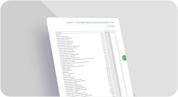 391 Life Is On | Schneider Electric www.se.com Financial Statements 5. Chapter 5 – Consolidated financial statements at December 31, 2021 (in % of interest) Dec. 31, 2021 Dec. 31,2020 Scanelec France 100 100 Schneider Electric Alpes France 100 100 Schneider Electric Energy France France 100 100 Schneider Electric France France 100 100 Schneider Electric Industries SAS France 100 100 Schneider Electric International France 100 100 Schneider Electric IT France France 100 100 Schneider Electric Manufacturing Bourguebus France 100 100 Schneider Electric SE (Mother company) France 100 100 Schneider Electric Solar France France 100 100 Schneider Electric Systems France France 100 100 Schneider Electric Telecontrol France 100 100 Schneider Toshiba Inverter Europe SAS France 60 60 Schneider Toshiba Inverter SAS France 60 60 Société d’Appareillage Electrique Gardy France 100 100 Société d’Application et d’Ingenierie Industrielle et Informatique SAS – SA3I France 100 100 Société Electrique d’Aubenas France 100 100 Société Française de Construction Mécanique et Electrique France 100 100 Société Française Gardy France 100 100 Systèmes Equipements Tableaux Basse Tension France 100 100 Transfo Services France 100 100 Transformateurs SAS France 100 100 ABN GmbH Germany 100 100 Eberle Controls GmbH Germany 100 100 Merten GmbH Germany 100 100 ProLeit AG (sub-group) Germany 100 100 RIB GmbH (sub-group) Germany 100 8 7. 6 Schneider Electric Automation GmbH Germany 100 100 Schneider Electric Holding Germany GmbH Germany 100 100 Schneider Electric GmbH Germany 100 100 Schneider Electric Investment AG Germany 100 100 Schneider Electric Real Estate GmbH Germany 100 100 Schneider Electric Sachsenwerk GmbH Germany 100 100 Schneider Electric Systems Germany GmbH Germany 100 100 Schneider Electric AEBE Greece 100 100 Schneider Electric Energy Hungary LTD Hungary 100 100 Schneider Electric Hungaria Villamossagi ZRT Hungary 100 100 SE – CEE Schneider Electric Közep-Kelet Europai KFT Hungary 100 100 Schneider Electric Ireland Ltd Ireland 100 100 Schneider Electric IT Limited Ireland 100 100 Schneider Electric IT Logistics Europe Ltd Ireland 100 100 Validation technologies (Europe) Ltd Ireland 100 100 Eliwell Controls S.r.l. Italy 100 100 Eurotherm S.r.l. Italy 100 100 Schneider Electric Industrie Italia Spa Italy 100 100 Schneider Electric Spa Italy 100 100 Schneider Electric Systems Italia Spa Italy 100 100 Uniflair Spa Italy 100 100 Lexel Fabrika SIA Latvia 100 100 Schneider Electric Baltic Distribution Center Latvia 100 100 Schneider Electric Latvija SIA Latvia 100 100 UAB Schneider Electric Lietuva Lithuania 100 100 Industrielle de Réassurance SA Luxembourg 100 100 American Power Conversion Corporation (A.P.C.) BV Netherlands 100 100 APC International Corporation BV Netherlands 100 100 APC International Holdings BV Netherlands – 100 Clovis Systems B.V. Netherlands 70 – Schneider Electric Logistic Centre BV Netherlands 100 100 Schneider Electric Manufacturing The Netherlands BV Netherlands – 100 Schneider Electric Systems Netherlands BV Netherlands 100 100 Schneider Electric The Netherlands BV Netherlands 100 100 ELKO AS Norway 100 100 Eurotherm AS Norway 100 100 Lexel Holding Norge AS Norway 100 100 Schneider Electric Norge AS Norway 100 100 Elda Eltra Elektrotechnika S.A. Poland 100 100 Eurotherm Poland Sp. Z.o.o. Poland 100 100 Schneider Electric Industries Polska Sp. Z.o.o. Poland 100 100 Schneider Electric Polska Sp. Z.o.o. Poland 100 100