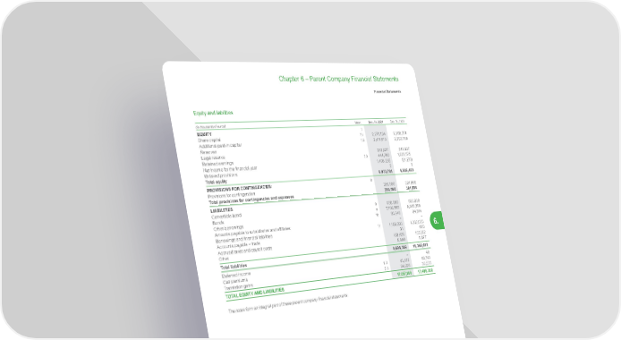 413 Life Is On | Schneider Electric www.se.com Chapter 6 – Parent Company Financial Statements Financial Statements 6. Equity and liabilities (in thousands of euros) Notes Dec. 31, 2021 Dec. 31, 2020 EQUITY 7 Share capital 7.1 2, 2 76 ,13 4 2,268,274 Additional paid-in capital 7. 2 2,411,613 2,203,758 Reserves Legal reserve 243,027 243,027 Retained earnings 7. 3 444,780 1,922,675 Net income for the financial year 1,498,235 (31,273) Untaxed provisions 2 2 Total equity 6,873,791 6,606,463 PROVISIONS FOR CONTINGENCIES: 8 Provisions for contingencies 350,596 391,880 Total provisions for contingencies and expenses 350,596 391,880 LIABILITIES Convertible bond 9 650,000 650,000 Bonds 9 7,700,665 8,246,269 Other borrowings 10 80,249 84,814 Amounts payable to subsidiaries and affiliates – – Borrowings and financial liabilities 11 1,150,000 1,302,000 Accounts payable – trade 31 680 Accrued taxes and payroll costs 109,426 107, 2 5 2 Other 5,998 5,677 Total liabilities 9,696,369 10,396,692 Deferred income – 40 Call premiums 6.3 51,472 6 2,74 3 Translation gains 2.3 84,928 30,533 TOTAL EQUITY AND LIABILITIES 17,057,15 6 17,488,350 The notes form an integral part of these parent company financial statements.