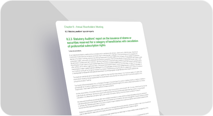 www.se.com Schneider Electric Universal Registration Document 2021 470 Chapter 8 – Annual Shareholders’ Meeting 8.2.3 Statutory Auditors’ report on the issuance of shares or securities reserved for a category of beneficiaries with cancellation of preferential subscription rights To the Shareholders, In our capacity as Statutory auditors of your company and in compliance with articles L. 228-92 and L. 225-135 et seq. of the French Commercial Code ( Code de commerce ), we hereby report on the proposal to delegate to the board of directors the competence to decide on the issue of ordinary shares or securities giving access to the share capital of the company, with cancellation of preferential subscription rights, reserved for (i) employees and officers of companies of the Schneider Electric Group affiliated with the Company under the terms and conditions set forth in Article L. 225-180 of the French Commercial Code ( Code de commerce ) and Article L. 3344-1 of the French Labour Code ( Code du travail ) and the head office of which is located outside France; (ii) and/or OPC mutual investment funds or other entities, with or without legal personality, of employee shareholders invested in equity securities of the company, the unit holders or shareholders of which consist of persons described in (i) of this paragraph; (iii) and/or any banking institution or affiliate or subsidiary of such institution acting at the Company’s request for purposes of implementing and giving effect to a shareholder incentive or investment or savings plan for the benefit of the persons described in (i) of this paragraph, an operation upon which you are called to vote. The maximum nominal amount of the increase in capital that may result from these issues is 1% of the share capital on the date of this shareholders’ meeting, it being specified that this amount shall be deducted from the ceiling set under the sixteenth resolution of this annual shareholders’ meeting. Your board of directors proposes that, on the basis of its report, it be authorized, for a period of eighteen months, to decide on whether to proceed with an increase in capital and to cancel your preferential subscription rights to the ordinary shares and securities to be issued. If applicable, it shall determine the final conditions of these operations. It is the responsibility of the board of directors to prepare a report in accordance with articles R. 225-113 et seq. of the French Commercial code ( Code de commerce ). Our role is to report on the fairness of the financial information taken from the accounts, on the proposed cancellation of preferential subscription rights, and on other information relating to the share issues provided in this report. We have performed those procedures which we considered necessary to comply with the professional guidance issued by the French national auditing body ( Compagnie Nationale des Commissaires aux Comptes ) for this type of engagement. These procedures consisted in verifying the information provided in the board of director’s report relating to these operations and the methods used to determine the issue price of the equity securities to be issued. Subject to a subsequent examination of the conditions for the issues that would be decided, we have no matters to report as to the methods used to determine the issue price of the equity securities to be issued provided in the board of director’s report. As the final conditions for the issues have not yet been determined, we cannot report on these conditions and, consequently, on the proposed cancellation of preferential subscription rights. In accordance with article R. 225-116 of the French Commercial Code ( Code de commerce ), we will issue a supplementary report, if necessary, when your board of directors has exercised this authorization. Paris-La Défense, March 11, 2022 The Statutory Auditors French original signed by MAZARS ERNST & YOUNG et Autres Loïc Wallaert Mathieu Mougard Alexandre Resten 8.2 Statutory auditors’ special reports