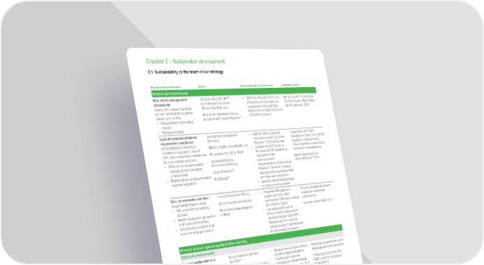 www.se.com Schneider Electric Universal Registration Document 2021 86 Chapter 2 – Sustainable development Risk description and impact Policies Main actions and 2021 performance Opportunity created Environment (continued) End-of-life management of products Safety risk if assets handled by non-certified third parties (repair, end-of-life): • People health and safety impact • Resource waste Circular offers: ECOFIT ™ , and takeback schemes (End-of-life, EOL, etc.) End-of-life information for our products with Green Premium ™ • SSE #10: 420,000 metric tons of avoided primary resource consumption through ‘take- back at end-of-use’ since 2017 (203,881 achieved) Market growth for Schneider Electric circular offers (repair, retrofit, takeback, EOL) Lack of product substance regulations compliance Strengthening of chemical substance regulation, market shift, and consumers preferences for eco-friendly products: • Difficulty to access market if products are forbidden or blacklisted • Multiplication of uncoordinated regional legislation Substances and Material Directive: REACh, RoHS, China RoHS, CA Proposition 65, TSCA, POP Schneider Electric Environmental Policy: Green Premium ™ EcoDesign ™ • SSE #6: 80% of product revenues covered by Green Premium ™ (78% achieved) • Substances of Concern In Products (SCIP) registration deployment and communication • Implementation of new Green Premium ™ claims to manage and promote recycled content and take back programs • Specific compliance analysis to unblock some markets Opportunity with Toxic Substances Control Act (TSCA) regulation to demonstrate robust substance and material process and transparency. Market opportunity for Green Premium ™ offers Soil, air and water pollution At Schneider Electric sites: • Non-compliance leading to fines • Health impacts on personnel and local communities • Site property pollution and environmental provisions Group Environment Policy Environmental risk analysis Environment due diligence in M&A • Integrated Management System with ISO 14001 certification (244 sites certified ISO 14001 in 2021). • Company-wide Look at Environmental Assessment and Risk Review (CLEARR) Assessment for industrial Global Supply Chain factories. • Environmental provisions Robust management system to drive environmental performance Increased stakeholder trust Product, project, system quality & offer reliability Deficient product safety Product malfunctions or failures could result in: • Liabilities for tangible or intangible damages, or personal injuries • Incurred costs related to the product recall, to new development expenditure, and use of technical and economic resources • New or more stringent standards or regulations for quality and safety controls could result in capital investment or costs of specific measures for compliance. All our sites are certified ISO 9001 Quality is one of our Trust pillars Phoenix program launched for 4 years is covering our End-To-End Supply Chain ReeD (Reliability End-To-End by Design) to cover Design practices Implement Nets on legacy offer to ensure we capture defects or potential defects internally. • Development of Agile method in Offer Creation enabling Quality and Customer Satisfaction Transformation, • Phoenix achievement in 2021 initiating move from Reactive to Predictive • ReeD program allows us in 2021 to kick off a strong learning path around Reliability Designer • Creation of the committee Offer Safety Alert Prevention, to coach all Root Causes Analysis Leaders Listening to signals from within the group and from customers Challenging innovation and R&D to seek for perpetual improvement Become a leader in products quality driving brand reputation and value 2.1 Sustainability at the heart of our strategy
