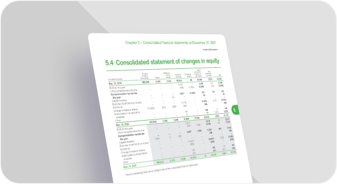 349 Life Is On | Schneider Electric www.se.com Financial Statements 5. Chapter 5 – Consolidated financial statements at December 31, 2021 5.4 Consolidated statement of changes in equity (in millions of euros) Number of shares (thousands) Capital Additional paid-in capital Retained earnings Translation reserve Equity attributable to owners of the parent Non- controlling interests Total Dec. 31, 2019 582,069 2,328 3 ,13 4 16,034 65 21,561 1,579 23 ,14 0 Profit for the year – – – 2,12 6 – 2 ,126 112 2,238 Other comprehensive income – – – (249) (1,606) (1,855) (43) (1,898) Comprehensive income for the year – – – 1,877 (1,606) 271 69 340 Capital increase – – 43 – – 43 – 43 Exercise of performance shares – – – – – – – – Dividends – – – (1,413) – (1,413) (112) (1,525) Change in treasury shares (15,000) (60) (929) 939 – (50) (50) Share-based compensation expense – – – 140 – 140 5 145 Other – – – 71 – 71 1,563 1,634 Dec. 31, 2020 567,069 2,268 2,248 17,6 4 8 (1,541) 20,623 3 ,10 4 23,727 Profit for the year – – – 3,204 3,204 69 3,273 Other comprehensive income – – – 453 1,555 2,008 331 2,339 Comprehensive income for the year – – – 3,657 1,555 5,212 400 5,612 Capital increase 1,964 8 208 – – 216 – 216 Exercise of performance shares – – – – – – – – Dividends – – – (1,4 47) – (1,447) (138) (1,585) Change in treasury shares – – – (262) – (262) – (262) Share-based compensation expense – – – 145 – 145 16 161 Other – – – (47) – (47) 287 240 Dec. 31, 2021 569,033 2,276 2,456 19,694 14 24,440 3,669 2 8 ,10 9 The accompanying notes are an integral part of the consolidated financial statements.