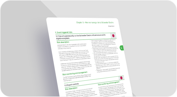 255 Life Is On | Schneider Electric www.se.com Chapter 3 – How we manage risk at Schneider Electric Strategic Report 3. 1. Event triggered risks 1.1 Risk of cybersecurity on the Schneider Electric infrastructure and its digital ecosystem Risk description Schneider Electric, like other organizations with a similar global footprint and presence, is exposed to the risk of cyberattacks and data privacy breaches. As an industrial and technology company, the Group has IT and Operational Technology activities spread over more than 25 sites, with dozens of R&D sites, and more than 200 production and logistic units. On those sites, Operational Technology systems are converging more and more with IT systems, especially through the use of Internet of Things (IoT) expanding the overall attack surface. Additionally, the move from a product-centered business model to a service-oriented business model with software (e.g., digital offers like “Advisors” software suites or managed digital services) and augmented data naturally increases cybersecurity risks, such as data breaches and intellectual property theft. Risk monitoring and management The NIST framework (Identify, Protect, Detect, Respond, and Recover) is used with a Cyber Risk Register and High-Value Assets program: • Cyber threats are mitigated by implementing cyber practices and capabilities, policy-driven controls, and enforcing mechanisms. For example, the Group implemented a Data Protection program, Source Code Management framework, and System & Solution security program. • Global Cyber incident management and response process is in place. Events and incidents are monitored through a Security Operations Center, driven jointly with the Group’s partners. • 99% of employees were trained on cybersecurity in 2021. Specific employee categories received mandatory trainings for risks linked to their activity. • Multiple cyber risk assessments were completed in 2021 by the Group’s cybersecurity consulting partners. Furthermore, the Group is conducting regular crisis simulation exercises on different scenarios. • Schneider Electric’s posture is continuously revisited and adapted through “reality checks”, including emergency and improvement plans across the Company and cyber scoring platforms. • Independent “reality checks” were performed: three cross- cutting internal audits and external assessments. 1.2 Export controls Risk description International, foreign, and national export control laws and regulations govern the transfer of goods, services, and technologies within a country or between countries and/or their nationals. Elements that may trigger restrictions and licensing requirements may include, but are not limited to, countries, parties, product, and end-uses. Schneider Electric being a Multi-National Corporation (MNC) with international operations spanning across more than 100 different countries worldwide, must constantly ensure full compliance to such laws and regulations by implementing a robust corporate export control compliance program. Any implications may result in a significant impact on the Group’s businesses, results, reputation, and financial position. Albeit that Schneider Electric’s product portfolio only has a limited product range that may have dual-use goods features as well as non-dual-use goods (e.g., breakers) that may be used in sensitive applications; restriction or licensing requirements may apply to these products, especially if associated with politically sensitive countries and destinations. Risk monitoring and management Schneider Electric has comprehensive policies and processes to ensure compliance with applicable export control laws and regulations (“Schneider Electric Export Control Program”) and to mitigate the above described risks. The Global Export Control Center of Excellence, as part of the Schneider Electric Global Legal and Risk Management Function, oversees the monitoring and enforcement of the Schneider Electric Export Control Program. The Schneider Electric Export Control Program may include, but is not limited to, embargo and restricted country, denied party, dual-use goods, and sensitive end-users screenings; incorporation of Export Control provision in the main sales and procurement contractual template; and conducting of regular awareness and online and classroom training sessions for all relevant Schneider Electric employees. The Schneider Electric Export Control Program will continue its enhancement and updates to ensure compliance with applicable export control laws and regulations.