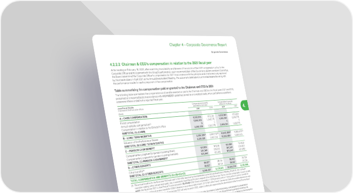 315 Life Is On | Schneider Electric www.se.com Chapter 4 – Corporate Governance Report Corporate Governance 4. 4.2.2.2 Chairman & CEO’s compensation in relation to the 2021 fiscal year At its meeting on February 16, 2022, after examining the suitability and fairness of the outcome of the 2021 compensation policy for the Corporate Officer and its alignment with the Group’s performance, upon recommendation of the Governance & Remunerations Committee, the Board determined the Corporate Officer’s compensation for 2021 in accordance with the principles and criteria previously approved by the shareholders in April 2021 at the Annual Shareholders’ Meeting. The outcome is detailed and commented hereinafter along with the performance results for each component of the compensation. Table summarizing the compensation paid or granted to the Chairman and CEO in 2021 The following table summarizes the compensation and benefits awarded or paid to the Chairman and CEO for the fiscal years 2021 and 2020, presented on a reported basis in accordance with AFEP-MEDEF guidelines as well as on a realized basis, where performance conditions assessment have ended in the reported fiscal year. Jean-Pascal Tricoire Chairman & Chief executive officer Compensation & benefits awarded for fiscal year Compensation & benefits realized in fiscal year (Euro) 2021 2020 2021 2020 A – CASH COMPENSATION Fixed compensation 1,000,000 875,000 1,000,000 875,000 Annual variable compensation (1) 1,990,300 1,048,775 1,990,300 1,048,775 Compensation in relation to the Director’s office 0 0 0 0 SUBTOTAL (A) (CASH) 2,990,300 1,923,775 2,990,300 1,923,775 B – LONG TERM INCENTIVE Valuation of the Performance Shares 3,326,329 (2) 2 , 8 97,70 0 (2) 10,022,858 (3) 6,968,935 (3) SUBTOTAL (B) LONG TERM INCENTIVE 3,326,329 2 , 8 97,70 0 10,022,858 6,968,935 C – PENSION CASH BENEFIT Complementary payment for pension building (fixed) 191,600 191,600 191,600 191,600 Complementary payment for pension building (variable) 381,341 229,652 381,341 229,652 SUBTOTAL (C) PENSION CASH BENEFIT 572,941 421,252 572,941 421,252 D – OTHER BENEFITS Other benefits (4) 56,637 3 6 ,124 56,637 3 6 ,124 SUBTOTAL (D) OTHER BENEFITS 56,637 3 6 ,124 56,637 3 6 ,124 TOTAL COMPENSATION AND BENEFITS (A)+(B)+(C)+(D) 6,946,207 5,278,851 13,642,736 9,350,086 (1) The annual incentive for the fiscal year 2020 was paid in 2021 after approval by the shareholders at the Annual Shareholders’ Meeting of April 28, 2021 of the 6 th resolution relating to the compensation paid, due, or awarded to Jean-Pascal Tricoire in respect of the 2020 fiscal year. Hence, the total compensation in cash actually paid in the fiscal year 2021 to Jean-Pascal Tricoire amounts to €2,470,027 (2021 fixed compensation + 2020 annual incentive + fixed portion of pension benefit for 2021 + variable portion of pension benefit for 2020). Likewise, in accordance with Article L.22-10-34 II of the French Commercial Code, the variable elements in cash awarded to Jean-Pascal Tricoire for the financial year 2021 will only be paid in 2022, subject to their prior approval by the shareholders at the Annual Shareholders’ Meeting of May 5, 2022 under the 8 th resolution. (2) Value of Performance Shares granted during fiscal year – As per AFEP-MEDEF Corporate Governance Code methodology, compensation is presented on a reported basis. Long-term incentives for the fiscal year include Performance Shares granted during the fiscal year, the performance period of which has not elapsed. The value of Performance Shares corresponds to the number of shares granted, before reduction on account of performance, multiplied by the share price determined in line with IFRS accounting standards. (3) Value of Performance Shares deemed vested during the fiscal year – In order to facilitate the analysis, the Long-term incentives are also presented on realized value basis, where the value of Performance Shares corresponds to the actual number of shares (granted in previous years) deemed vested at the end of the fiscal year, after reduction for performance conditions, multiplied by the share price on December 31, 2020 or 2021, as the case may be. (4) Other benefits include company car, employer matching contributions to capital increase for employees or contributions to Employee Saving Plan and to collective Pension Saving Plan (PERCO) as well as benefits from French profit-sharing plan.