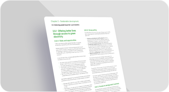www.se.com Schneider Electric Universal Registration Document 2021 190 Chapter 2 – Sustainable development 2.6 Delivering social impact for a just transition 2.6.1 Offering better lives through access to green electricity 2.6.1.1 Risks and opportunities Today, more than two billion people have little or no access to electricity, representing 25% of the world’s population. Notable progress has been made on energy access in recent years, with the number of people living without electricity dropping to 759 million in 2019 from one billion in 2016 ( 1 ) . Nonetheless, as SEforAll (2) puts it, “electricity access is growing, but not for everyone”. In sub-Saharan Africa, colossal additional efforts must be made to achieve universal access: • About 600 million people in sub-Saharan Africa do not have access to electricity, i.e., more than one in two inhabitants; • This trend is increasing, due to demographic pressure; • The COVID-19 pandemic will have further amplified the difficulties of access to electricity in the most fragile areas; according to SEforAll, the pandemic could increase the non-electrified population by 100 million in 2020; • By 2030, on the current trajectory, 85% of the remaining unelectrified world population will be in sub-Saharan Africa. Asia-Pacific is approaching universal electrification with ambitious government off-grid electrification and grid extension programs: • Between 2000 and 2018, more than 1.4 billion people gained access to electricity worldwide, mainly in developing countries in Asia; • Nevertheless, the grid can be unreliable in remote areas, where it must be supplemented with solar-powered backup solutions; • The growing need for equipment and electrical appliances for productive use in rural areas must be met with renewable energy solutions. In addition to the 759 million people without electricity access, an estimated one billion people have access to intermittent, unreliable, or dangerous electricity. To achieve United Nations Sustainable Development Goal 7 (SDG 7), access to affordable, reliable, sustainable, and modern energy must be a major objective, as the lack of energy affects the poorest: among the energy poor, three quarters are also multidimensionally poor in terms of human development 2 . Access to green electricity offers a chance to live a better life, as it can have a positive multiplier effect on all socio-economic dimensions of the individual or community: livelihood, health, education, security, and empowerment of women, while fighting against climate change by replacing fossil solutions. (1) Source: Tracking SDG 7: The Energy Progress Report, produced by the International Energy Agency (IEA), the International Renewable Energy Agency (IRENA), the United Nations Statistics Division (UNSD), the World Bank, and the World Health Organization (WHO). (2) Using the Global Multidimensional Poverty Index. 2.6.1.2 Group policy Schneider Electric launched its Access to Energy program in 2009, with a unique approach combining three dimensions that enrich each other: • A training and entrepreneurship program aimed at developing skills in the electricity trades and supporting entrepreneurs in this area, in particular women, in order to promote sustainable and inclusive local development. • A social and inclusive business, with products and solutions for rural electrification (collective and individual, such as solar lanterns, solar home systems including Pay-As-You-Go features, solar water pumping systems, microgrids including plug and play containerized solutions, etc.), creating local jobs in distribution, energy services, electricity powered industries, etc. • Impact investment funds to support local economies in gaining access to modern energy and reducing energy poverty. The purpose of the Access to Energy social business is to bring clean electricity to populations in emerging markets both as a fundamental right and a means for social and economic development, with a safe, affordable, reliable, and sustainable energy offer. At Schneider, we call this Electricity for Life and Electricity for Livelihood. The ambition of the Access to Energy social business is to connect an additional 20 million people between 2021 and 2025, and 70 million by 2030. 34 million people have already benefited from the Schneider energy access solutions between 2009 and 2021. The impact investment funds will contribute to these targets, within the scope of the invested companies contributing to the mission of providing access to green electricity. More broadly, Schneider’s vision of impact investing is to fund high social impact initiatives, such as energy and digital services that enable all generations to contribute to a better future. 2.6.1.3 Access to energy social business Schneider Electric develops products and solutions to meet a range of both individual and community needs across the energy chain, from solar lanterns and solar home systems to decentralized small power plants, water pumping systems, and street lighting. These offerings also make it possible to maintain a sustainable economic and social activity as well as include and involve local communities in projects. 2.6.1.3.1 Governance A new governance of the Access to Energy business was put in place from 2021. It is placed under the responsibility of the Access to Energy Business Vice-President, reporting to the Sustainability Senior Vice-President. An advisory board dedicated to the subject has been set up, made up of the Chief Strategy & Sustainability Officer, the Energy Management Executive Vice-President, the International Operations Executive Vice-President, as well as the Sustainability Senior Vice-President and the Access to Energy Business Vice-President, and, once a year, the Chairman & CEO. The subject was also one of those reviewed in 2021 by the Schneider Electric Stakeholder Committee.