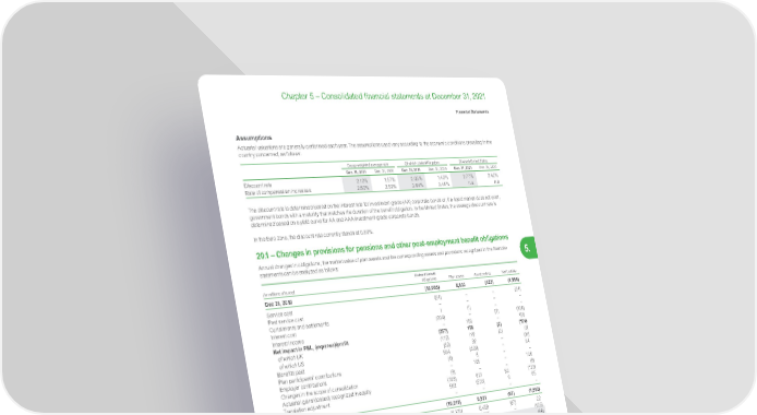 379 Life Is On | Schneider Electric www.se.com Financial Statements 5. Chapter 5 – Consolidated financial statements at December 31, 2021 Assumptions Actuarial valuations are generally performed each year. The assumptions used vary according to the economic conditions prevailing in the country concerned, as follows: Group weighted average rate Of which United Kingdom Of which United States Dec. 31, 2021 Dec. 31, 2020 Dec. 31, 2021 Dec. 31, 2020 Dec. 31, 2021 Dec. 31, 2020 Discount rate 2.12 % 1.57% 2.05% 1.40% 2.77% 2.42% Rate of compensation increases 2.60% 2.52% 3.64% 3.46% n.a. n.a The discount rate is determined based on the interest rate for investment-grade (AA) corporate bonds or, if a liquid market does not exist, government bonds with a maturity that matches the duration of the benefit obligation. In the United States, the average discount rate is determined based on a yield curve for AA and AAA investment-grade corporate bonds. In the Euro zone, the discount rate currently stands at 0.80%. 20.1 – Changes in provisions for pensions and other post-employment benefit obligations Annual changes in obligations, the market value of plan assets and the corresponding assets and provisions recognized in the financial statements can be analyzed as follows: (in millions of euros) Defined benefit obligations Plan assets Asset ceiling Net Liability Dec 31, 2019 (10,065) 8,633 (123) (1,555) Service cost (54) – – (54) Past service cost – – – – Curtailments and settlements 1 (1) – – Interest cost (204) – (2) (206) Interest income – 159 – 159 Net impact in P&L, (expense)/profit (257) 158 (2) (101) of which UK (119) 118 (2) (3) of which US (69) 38 – (31) Benefits paid 554 (500) – 54 Plan participants’ contributions (6) 6 – – Employer contributions – 106 – 106 Changes in the scope of consolidation (8) – – (8) Actuarial gains/(losses) recognized in equity (796) 621 52 (123) Translation adjustment 562 (503) 6 65 Other changes – – – – Dec. 31, 2020 (10,016) 8,521 (67) (1,562) of which UK (6,370) 6,459 (67) 22 of which US (2,140) 1, 535 – (605) Service cost (66) – – (66) Past service cost 2 – – 2 Curtailments and settlements 25 (1) – 24 Interest cost (159) – (1) (160) Interest income – 121 – 121 Net impact in P&L, (expense)/profit (198) 120 (1) (79) of which UK (94) 86 (1) (9) of which US (52) 30 – (22) Benefits paid 532 (478) – 54 Plan participants’ contributions (6) 6 – – Employer contributions – 136 – 136 Changes in the scope of consolidation 9 – – 9 Actuarial gains/(losses) recognized in equity 701 (117 ) (133) 4 51 Translation adjustment (631) 606 (9) (34) Other changes (77) 77 – – Dec. 31, 2021 (9,686) 8,871 (210) (1,025) of which UK (6,017) 6,524 (184) 323 of which US (2,170) 1,6 92 – (478) The Group defined benefit obligations of EUR 9.686 million (2020: EUR 10.016 million) are broken down as EUR 9.470 million (2020: EUR 9.802 million) for post-employment benefits and EUR 216 million (2020: EUR 214 million) for other post-employment and long-term benefits.