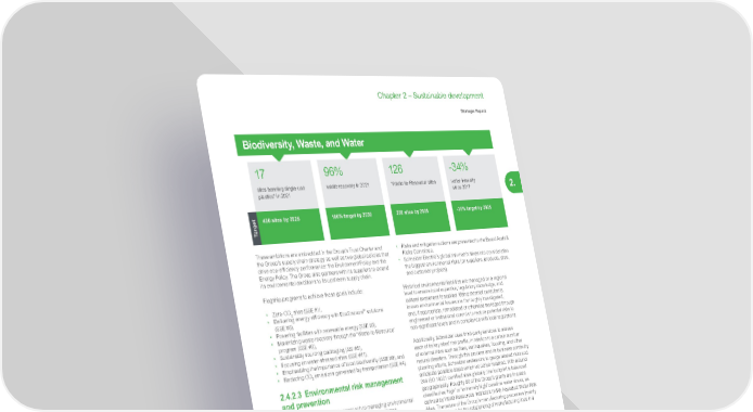 151 Life Is On | Schneider Electric www.se.com Chapter 2 – Sustainable development Strategic Report 2. These ambitions are embedded in the Group’s Trust Charter and the Group’s supply chain strategy as well as two global policies that drive eco-efficiency performance: the Environment Policy and the Energy Policy. The Group also partners with its suppliers to extend its environmental ambitions to its upstream supply chain. Flagship programs to achieve these goals include: • Zero-CO 2 sites (SSE #1), • Delivering energy efficiency with EcoStruxure ™ solutions (SSE #5), • Powering facilities with renewable energy (SSE #3), • Maximizing waste recovery through the ‘Waste-to-Resource’ program (SSE #9), • Sustainably sourcing packaging (SSI #5), • Focusing on water-stressed sites (SSE #11), • Emphasizing the importance of local biodiversity (SSE #8), and • Reducing CO 2 emissions generated by transportation (SSE #4). 2.4.2.3 Environmental risk management and prevention The Group takes a proactive approach to managing environmental liabilities and risks. Environmental regulatory compliance, environmental management systems, and continuous improvement are the foundation of the Group’s environmental risk management and prevention program for current, former, and prospective operations. Key ongoing initiatives include: • The Integrated Management System (IMS) covers the Group’s plants, distribution centers, and large offices, and hosts ISO 14001, ISO 50001, ISO 9001, and OHSAS 18000/ISO 45001 compliance management systems. Each site is audited periodically, either externally by Bureau Veritas (every three years), or internally. • The Company-wide Look at Environmental Assessment and Risk Review program (CLEARR) was continued, with additional and updated surveys of select manufacturing sites that focused on historical and current potential environmental risks. • Environmental risks and provisions are reviewed with local and corporate finance, as well as legal functions. • As part of mergers, acquisitions, and disposals, thorough environmental due diligence of sites is conducted where chemicals are or have been used. Any environmental risks or liabilities identified are addressed through proper risk management activities. • Risks and mitigation actions are presented to the Board Audit & Risks Committee. • Schneider Electric’s global risk matrix takes into consideration the biggest environmental risks (on suppliers, products, sites, and customer projects). Historical environmental liabilities are managed on a regional level to ensure local expertise, regulatory knowledge, and cultural awareness is applied. Using external consultants, known environmental issues are thoroughly investigated, and, if appropriate, remediated or otherwise managed through engineered or institutional controls to reduce potential risks to non-significant levels and in compliance with local regulations. Additionally, Schneider uses third-party services to assess each of its key sites’ risk profile, in relation to a certain number of external risks such as fires, earthquakes, flooding, and other natural disasters. Through this process and its business continuity planning efforts, Schneider endeavors to gauge related risks and anticipate possible steps which would be required. With around 244 ISO 14001 certified sites globally, the footprint is balanced geographically. Roughly 90 of the Group’s plants are in areas classified as ‘high’ or ‘extremely high’ baseline water stress, as defined by World Resources Institute’s (WRI) Aqueduct Water Risk Atlas. The nature of the Group’s manufacturing processes (mainly assembly) allows for the rebalancing of manufacturing lines in a fairly prompt manner, if needed. During the year 2021, no new material environmental impacts were identified. Furthermore, no Schneider Electric sites are Seveso-classified. 2.4.2.4 ISO 14001 and ISO 50001 certification ISO 14001 certification allows Schneider Electric to define and sustain robust environment governance on its sites, supporting continuous improvement to deliver environmental performance. As soon as the ISO 14001 environmental management standard was published in 1996, Schneider decided to certify its sites. The Group certifies all industrial and logistics sites comprised of more than 50 employees within two years of their acquisition or creation, and all large tertiary sites of more than 500 employees. 244 sites are certified ISO 14001 as of the end of 2021, representing approximately 76% of the Group scope based on the share of site surfaces, 82% of the Group scope in terms of energy consumption, and over 85% of the Group scope in terms of water consumption, waste generation, and Volatile Organic Compounds (VOC) emissions. 17 sites banning single-use plastics* in 2021 96% waste recovery in 2021 126 ‘Waste-to-Resource’ sites -34% water intensity since 2017 400 sites by 2025 100% target by 2030 200 sites by 2025 -35% target by 2025 Biodiversity, Waste, and Water Target * The scope of the single-use plastics ban for the biodiversity program is “consumer” plastics (e.g. cups, cutlery, gifts/souvenirs, etc.). “Industrial” plastics (e.g. primary/ secondary packaging, products) are covered in Schneider Electric’s SSI #4 and SSI #5 programs.