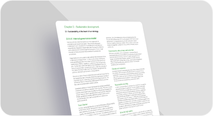 www.se.com Schneider Electric Universal Registration Document 2021 74 Chapter 2 – Sustainable development 2.1 Sustainability at the heart of our strategy 2.1.4.4 Internal governance model Internal policies create the backbone of an organization’s compliance and security program. They ensure employees understand how to implement critical tasks and meet behavior expectations. Regulators have made clear the need for effective policy development and management programs. It is no longer enough to merely document the existence of policies and procedures. Organizations must be able to demonstrate that employees know, understand and apply them. In other words, simply developing and publishing policies is no longer sufficient in the eyes of our stakeholders (NGOs, regulators, customers, financial partners, etc.). To that end, Schneider Electric has established a four tier form of documentation pyramid of norms, under the umbrella of its Code of Conduct called the Trust Charter, strengthened by policies, standards, procedures, and guidelines. Policies consist of formal statements produced and supported by the leadership team, that state where the organization stands on important issues. Schneider has around 85 global policies. The Schneider Electric Global Policy Management Policy provides the rules to be followed for global policies. Standards defined in these internal policies assign quantifiable measures and define acceptable level of quality. They aim to make a policy more meaningful and effective. Procedures establish the proper steps to take to operationalize a policy and/or standard. Finally, guidelines provide additional guidance with a set of recommendations to clarify expectations in relation to a given procedure. Trust Charter In 2021, Schneider Electric evolved its Principles of Responsibility to the Trust Charter, acting as its Code of Conduct and demonstrating its commitment to ethics, safety, sustainability, quality, and cybersecurity. It is an executive summary of our policies and a guide on how we work. It is available publicly on our website in 30 languages. Further details are provided on page 94. Human rights & corporate citizenship In 2017, Schneider Electric drafted a specific Human Rights Policy as part of a broader program on duty of vigilance in its value chain and in line with the United Nations Guiding Principles on Business and Human Rights (see page 106). Human resources and safety The Group’s Human Resources policies cover the following topics: diversity, equity and inclusion, health & well-being, safety, security and travel, employee engagement, family leave, anti-harassment, recruiting, international mobility, training, human capital development, talent identification, total remuneration, social benefits, and COVID-19. These apply to the Group and are accompanied by global processes. Ethical business conduct In addition to the Trust Charter, different policies bolster the Group’s commitments in terms of business ethics and integrity. The Business Agents Policy specifies the rules to be followed when an external stakeholder is solicited to get a deal and integrates the approval process of business agents. The Internal Fraud Investigation directive indicates the commitment to whistleblower protection. The Gifts & Hospitality Policy was approved by the Group’s CEO in December 2015 and updated in 2021 before local deployment. It is supplemented by an anti-corruption Code of Conduct detailing related processes. Other policies cover social media management, competition law, conflict of interest, export control, etc. Cybersecurity, data privacy and protection With the acceleration of the digitalization, Schneider Electric developed many policies to reinforce its cybersecurity and respect personal data and privacy, such as IT asset management and usage, acceptable use of assets, general information security, data classification, global data privacy, user access management policy, email security policy, and many others. It is the pillar containing the most policies. Climate and resources Schneider Electric’s environmental policy aims to improve industrial processes, reinforce product EcoDesign and incorporate Group customers’ concerns about environmental protection by providing them with product and service solutions. It is bolstered by the Energy and Environment policies. These policies apply to the Group and are accompanied by global action plans. Responsible sourcing In 2016, Schneider Electric renewed the charter for its suppliers, called the Supplier Guide Book. The first chapter of this book sets out the Group’s sustainability expectations in five areas: environment, fair and ethical business practices, sustainable purchasing, working conditions, and human rights. These requirements are detailed in a dedicated document called the Supplier Code of Conduct. In 2018, the Group adopted the Responsible Business Alliance (RBA) Code of Conduct for suppliers. In October 2021, Schneider renewed its Supplier Code of Conduct whereby it requires all its suppliers to review their own operations, take ambitious targets, and initiate bold actions in the areas mentioned in this Supplier Code of Conduct. Strive for high quality Schneider’s priority is to delight its customers with an outstanding end-to-end experience. Quality is every customer’s right and every employee’s responsibility. Experience is the most important driver for customers, defining the business relationships they sustain with suppliers and partners. The Group’s customers place trust in its resilient, highly personalized, multi-channel experience, and the superior quality of its products. To ensure this, the company acts with agility, discipline, and good business sense throughout the offer life cycle from creation to supply, manufacturing, delivery, when in operation and when being serviced. The Group has deployed a specific Quality Directive “Managing Customer Safety Risks” and a Quality 