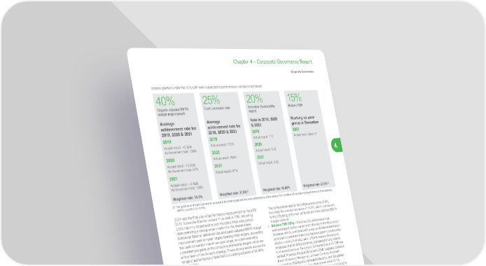 321 Life Is On | Schneider Electric www.se.com Chapter 4 – Corporate Governance Report Corporate Governance 4. Shares granted under the 2019 LTIP were subjected to performance conditions as follows: 40% Organic adjusted EBITA margin improvement 25% Cash conversion rate 20% Schneider Sustainability Impact 15% Relative TSR Average achievement rate for 2019, 2020 & 2021 2019 Actual result: +0.7pts Achievement rate: 100% 2020 Actual result: +0.2pts Achievement rate: 40% 2021 Actual result: +1.4pts Achievement rate: 100% Average achievement rate for 2019, 2020 & 2021 2019 Actual result: 121% 2020 Actual result: 159% 2021 Actual result: 87% Note in 2019, 2020 & 2021 2019 Actual result: 7.77 2020 Actual result: 9.32 2021 Actual result: 3.92 Ranking vs. peer group in December 2021 Actual result: Rank 1 st Weighted rate: 31.5% Weighted rate: 37.5% (1) Weighted rate: 16.86% Weighted rate: 22.5% (1) (1) The good level of cash conversion exceeded the initial target and the over-performance of the relative TSR condition off-set the under-performance of the adjusted EBITA condition (for 8.5%). 2021 was the final year of performance measurement for the LTIP 2019. Schneider Electric ranked 1 st on relative TSR, delivering 213% return to shareholders over the same three-year period, demonstrating a strong value creation for the shareholders. Schneider Electric delivered robust organic adjusted EBITA margin improvement year-on-year, largely beating initial targets, exceeding the cash conversion rate three-year target, and demonstrating consistent progress on the Group’s sustainability targets which are at the heart of the Group’s strategy. These strong results across the range of performance criteria led to a vesting outcome of 96.86% out of 100%. 0% 100% 31.5% 8.5% 25% 16.86% 96.86% 15 % Adjusted EBITA margin (organic) improvement (40%) Cash conversion Rate (25%) Relative TSR (15%) Schneider Sustainability Impact (20%) Total weighted achievement rate Achievement Scale LTIP 2019 Performance criteria achievement • Organic adjusted EBITA margin improvement (40%) – During the 3 years plan, the adjusted EBITA organic margin improved by more than +0.7pts on average, reflecting the successful execution of the strategy combining top line growth, positive net pricing, better mix, industrial productivity, and better efficiency to reduce SFCs. Overall, the achievement rate for this criterion was 31.5% (out of 40%). • Cash conversion (25%) – Our efforts on cash management delivered outstanding results consistently over the three- year period with an average cash conversion rate c. 122.3%, outperforming the target of 100% average cash conversion. The achievement rate for this criterion was set at 37.5%, including the over-performance of 12.5%, which contributed to the offsetting of the non-achievement of the adjusted EBITA margin criterion. • Relative TSR (15%) – The Group’s performance was acknowledged by the market and reflected in the stock price increase, which, combined with a robust dividend distribution policy and consistent share buy-back program to balance the dilution coming from allocation of Performance Shares and employee shareholding schemes, generated strong returns to shareholders over the period. Schneider Electric’s TSR was ranked 1 st versus the selected peers (ABB, Legrand, Siemens, Eaton, Emerson, Honeywell, Johnson Controls, Rockwell Automation, Fuji Electric, Mitsubishi Electric, and Yokogawa). The achievement rate for this criterion was set at 22.5%, including the over-performance of 7.5%, which contributed to the offsetting of the non-achievement of the adjusted EBITA margin criterion. • Schneider Sustainability Impact (SSI) (20%) – The SSI provides, on a scoring scale of 10, an overall measure of the Group’s progress on sustainability issues. Over the last three years, Schneider Electric demonstrated strong delivery and continuous improvement on its sustainability programs. The SSI reached a score of 3.92/10 end of 2021 exceeding its 3.75/10 target set by the Board for this criterion, which resulted in an achievement rate of 80.2% for 2021 with overall 16.86% shares vesting out of 20% allocated to this criterion. The fact that the compensation mechanism has materialized this year does not create any disconnection between pay and performance considering that the payout rate actually reflects the good performance of the Company over the last 3 years and the strong 2021 results. In addition, this result is aligned with the shareholders’ experience, the TSR being 213% over this period. Historical vesting of the Corporate Officers’ Performance Share plans: LT I P 2 019 96.86% LT I P 2 018 9 8 .18% LT I P 2 017 99.54% LT I P 2 016 91.46% LT I P 2 015 71% LT I P 2 014 78%