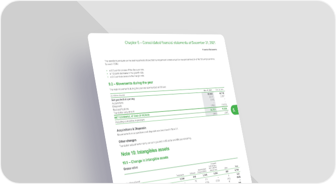 367 Life Is On | Schneider Electric www.se.com Financial Statements 5. Chapter 5 – Consolidated financial statements at December 31, 2021 The sensitivity analysis on the test hypothesis shows that no impairment losses would be recognized in each of the following scenarios, for each CGU: • a 0.5 point increase of the discount rate; • a 1.0 point decrease in the growth rate; • a 0.5 point decrease in the margin rate. 9.2 – Movements during the year The main movements during the year are summarized as follows: (in millions of euros) Dec. 31, 2021 Dec. 31, 2020 Net goodwill at opening 19,956 18,719 Acquisitions 3,717 2,287 Disposals (118) – Reclassifications – – Translation adjustment 1,16 8 (1,050) NET GOODWILL AT END OF PERIOD 24,723 19,956 including cumulative impairment (367) (367) Acquisitions & Disposals Movements from acquisitions and disposals are described in Note 2.1. Other changes Translation adjustments mainly concern goodwill in US dollar and UK pound sterling. Note 10: Intangibles assets 10.1 – Change in intangible assets Gross value (in millions of euros) Trademarks Software Development Projects (R&D) Acquired technologies and customer relationships Other Total Dec. 31, 2019 2,590 918 3,315 2,691 202 9,716 Acquisitions – 19 311 – 2 332 Translation adjustments (166) (31) (100) (223) (48) (568) Reclassifications – 53 (64) – 11 – Changes in scope of consolidation and other 71 5 16 824 (1) 915 Dec. 31, 2020 2,495 964 3,478 3,292 166 10,395 Acquisitions – 22 307 4 – 333 Translation adjustments 162 17 61 338 18 596 Reclassifications 41 19 (14) (101) 28 (27) Changes in scope of consolidation and other 163 19 (9) 1,253 4 1,430 Dec. 31, 2021 2,861 1,041 3,823 4,786 216 12,727