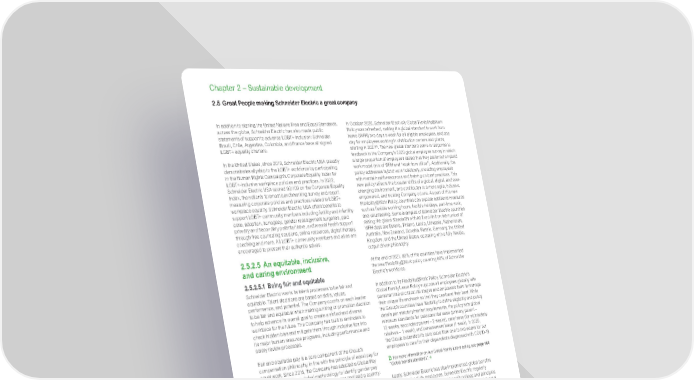 www.se.com Schneider Electric Universal Registration Document 2021 174 Chapter 2 – Sustainable development 2.5 Great People making Schneider Electric a great company In addition to signing the United Nations Free and Equal Standards, across the globe, Schneider Electric has also made public statements of support to advance LGBT+ inclusion: Schneider Brazil, Chile, Argentina, Colombia, and France have all signed LGBT+ equality charters. In the United States, since 2019, Schneider Electric USA proudly demonstrates allyship to the LGBT+ workforce by participating in the Human Rights Campaign’s Corporate Equality Index for LGBT+-inclusive workplace policies and practices. In 2022, Schneider Electric USA scored 90/100 on the Corporate Equality Index, the nation’s foremost benchmarking survey and report measuring corporate policies and practices related to LGBT+ workplace equality. Schneider Electric USA offers benefits to support LGBT+ community members including fertility and infertility care, adoption, surrogacy, gender reassignment surgeries, paid primary and secondary parental leave, and mental health support through free counseling sessions, online resources, digital therapy, coaching and more. All LGBT+ community members and allies are encouraged to present their authentic selves. 2.5.2.5 An equitable, inclusive, and caring environment 2.5.2.5.1 Being fair and equitable Schneider Electric wants its talent processes to be fair and equitable. Talent decisions are based on skills, values, performance, and potential. The Company counts on each leader to be fair and equitable when making a hiring or promotion decision to help advance its overall goal to create a skilled and diverse workforce for the future. The Company has built in reminders to check hidden bias and mitigate them through inclusive tips into its major human resource programs, including performance and salary review processes. Fair and equitable pay is a core component of the Group’s compensation philosophy, in line with the principle of equal pay for equal work. Since 2015, the Company has adopted a Global Pay Equity Framework – a global methodology to identify gender pay gaps within comparable groups of employees and lead a country- driven approach to address gaps with appropriate corrective actions. With the help of this Framework, Schneider Electric has committed to reaching <1% pay gap for both females and males by 2025. As of end 2021, the pay gap was -1.61% for females and 1.11% for males, on track with target. To learn more, please see page 182 . 2.5.2.5.2 Managing our unique lives and work New Ways of Working Schneider Electric wants all employees to be able to manage their unique lives and work in the way that works best for them and has implemented several policies to this end. In October 2020, Schneider Electric’s Global Flexibility@Work Policy was refreshed, making it a global standard to work from home (WFH) two days a week for all eligible employees, and one day for employees working in distribution centers and plants, starting in 2021 (1) . The new global standard came in response to feedback in the Company’s 2020 global employee survey in which a large proportion of employees stated that they preferred a hybrid work model (mix of WFH and “work from office”). Additionally, the policy addresses hybrid work holistically, providing employees with mental health resources and training on best practices. This new policy reflects the broader shifts of a global, digital, and ever- changing environment, and contributes to a more agile, inclusive, empowered, and trusting Company culture. As part of this new Flexibility@Work Policy, countries can explore additional measures such as flexible working hours, flexible holidays, part-time work, and volunteering. Some examples of Schneider Electric countries raising the global standards with no fixed limit on the number of WFH days are Estonia, Finland, Latvia, Lithuania, Netherlands, Australia, New Zealand, Slovakia, Russia, Germany, the United Kingdom, and the United States, operating with a fully flexible, output driven philosophy. At the end of 2021, 99% of the countries have implemented the new Flexibility@Work policy covering 88% of Schneider Electric’s workforce. In addition to its Flexibility@Work Policy, Schneider Electric’s Global Family Leave Policy supports all employees globally with personal time at critical life stages and empowers them to manage their unique life and work so that they can be at their best. While the Group’s countries have flexibility to define eligibility and policy details per statutory/market requirements, the policy sets global minimum standards for paid parental leave (primary parent – 12 weeks, secondary parent – 2 weeks), care leave (for sick/elderly relatives – 1 week); and bereavement leave (1 week). In 2020, the Group expanded its care leave from one to two weeks for our employees to care for their dependents diagnosed with COVID-19. For more information on our Global Family Leave policy, see page 184 “Global benefit standards”. Lastly, Schneider Electric has also implemented global benefits standards for all its employees. Schneider Electric regularly reviews compliance with its global benefit policies and principles to ensure that its inclusive global benefit standards are delivered for everyone, everywhere. These standards cover healthcare, family leave, and life cover. To learn more on this, please refer to page 184 . 2.5.2.5.3 Promoting well-being and mental health Well-being in our DNA Well-being has been a strategic priority since 2015. Schneider Electric’s well-being ambition is to create an environment where employees are empowered to manage their unique life and work by making the most of their energy. (1) Eligibility is based on employee’s role and requirements for on-site work and is determined by country/territory with additional input from managers. Some essential roles, e.g., Plant & 