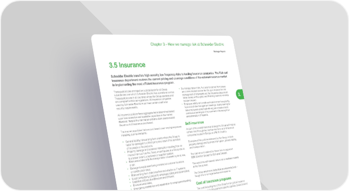 265 Life Is On | Schneider Electric www.se.com Chapter 3 – How we manage risk at Schneider Electric Strategic Report 3. 3.5 Insurance Schneider Electric transfers high severity, low frequency risks to leading insurance companies. The Risk and Insurance department reviews the current pricing and coverage conditions of the external insurance market in implementing the most efficient insurance program. These policies are arranged on a global basis for all Group subsidiaries over which Schneider Electric has operational control. These policies are in all countries where the Group operates and are compliant with local regulations. All insurance companies used by Schneider Electric must meet certain credit and security requirements. All insurance policies have aggregate limits determined based upon loss scenarios and available capacities on the market. However, there is the risk that an extreme claim could exceed the amount of insurance purchased. The insurance policies that are purchased cover varying exposures including, but not limited to: • General liability risks arising from events where the Group is liable for damages to a third party as a result of the activities of its people or its products; • Property damage and business interruption resulting from an insured risk such as fire, flood, or earthquake at a Group site or, to a lesser extent, a customer or supplier location; • Risks associated with the transportation of assets by land, sea, or air; • Damage to equipment being installed at customer locations or construction sites; • Risks arising from data breaches and attacks on IT systems; • Local compulsory policies for employee safety and automobiles; • Liabilities of Executive Directors and Officers; • Environmental risks; • Emergency assistance and repatriation for employees travelling. Insurable risk mitigations The Group identifies and measures the impact of the main insurable risks with a view to reducing or eliminating their impact. • In order to minimize the risks of damage and protect our production capacity, protection standards (including for the sites managed by third parties) are defined, and main industrial sites are audited by an independent loss prevention company with a process to action any recommendations from these audits. • Business continuity plans are implemented, reviewed, and tested, in particular for the Group’s main sites and critical suppliers. These plans are developed to identify internal alternative manufacturing and storage solutions to reduce the disruption to the business. • Crisis management tools are implemented in conjunction with the Group’s Global Security department. These are tested on a systematic basis. Regular exercises are performed to identify areas for improvement. • Hazard and vulnerability studies are carried out to protect our people and our equipment. • For transportation risks, the lessons learned from losses are communicated across the Group to improve the risk management of shipments and the Insurance department liaise closely with Logistic and Planning teams to minimize incident impact. • Employee safety and a safe work environment are priority topics at all site management meetings. Safety training for new employees combined with regular reviews ensure continuous learning and improvement in the recognition and elimination of hazards. Self-insurance As part of the overall insurance strategy the Group self-insures certain risks through two captive insurance and reinsurance companies located in Europe and North America. Examples of the policies reinsured by the Group, include property damage and business interruption, general liability, and transportation. The total amount retained for these risks is capped at EUR 20 million (except for USA and Canada). The cost of the self-insured risks is not considered material at the Group level. The Group assumes a deductible at a site/entity level – though this is not regarded as self-insurance. Cost of insurance programs The cost (including tax) of the Group’s main global insurance programs, excluding premiums paid to captives, totaled around EUR 24 million in 2021.