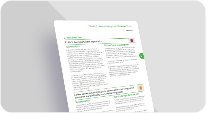 261 Life Is On | Schneider Electric www.se.com Chapter 3 – How we manage risk at Schneider Electric Strategic Report 3. 2. Trend driven risks 2.1 World deglobalization and fragmentation Risk description Stable trade is beneficial for economic growth. Trends of increased mercantilism is leading towards regionalization of trade around the United States, China, Russia, Europe, and Indian poles. Regionalized, rather than globally balanced government regulations and policies on, but not limited to, digitization, circularity, carbon, supply chain management, and others could handicap offer development efficiency through redundant efforts. These offer development duplication efforts can potentially impact Schneider Electric’s profitability. In addition to the trade regionalization trend, technology decoupling, specifically between the USA and Chinese poles, have been observed through increased regulations. Furthermore, this acceleration of regional versus global trade and technology policies is increasing the pressure on the supply chains of global companies in the forms of both tariff and non-tariff barriers. As such, trade wars could disrupt Schneider Electric’s operations and global supply chain. The above-mentioned combination of both nationally orientated tariff and non-tariff burden could increase the cost to market and potentially adversely impact the Group profitability. Risk monitoring and management To mitigate the risk on supply chain efficiencies and tariff impacts, Schneider Electric has implemented a multi-hub organization. The Group has R&D and supply chain activities, suppliers, and commercial networks in the main international hubs, which are North America, EMEA, and Asia. In this multi-local context, Schneider Electric can rebalance its activities across geographies. This setup has proved pertinent as the Group has demonstrated a solid resilience in 2020 and 2021. Schneider Electric uses prospective scenarios planning, focusing on geopolitics and trade. While the pace of external changes continues at a historically unprecedented scale regionally, global teams are working across stakeholders from Business Units, Regional Operations, and Transversal Functions (i.e., Finance, Supply Chain, Legal, Marketing, R&D, HR). 2.2 New players such as digital giants, software players, and energy majors entering the energy efficiency and renewable energy space Risk description Schneider Electric operates in the energy market which attracts new players and creates a new competitive landscape. Indeed, the energy industry is undergoing major transformations and disruptions driven by the following main trends: • A net-zero world: pressure on climate change and sustainability call for a change in business practices; • An all-electrical world: oil majors urged to reduce their impacts on carbon emissions; • An all-digital world: increasing influence of digital giants and software players. In this context, Schneider Electric’s competition landscape is evolving, and the Group can now see some digital giants, software players, or large companies such as energy majors positioning themselves – directly or indirectly – as providers of energy efficiency, which may compete with the digital services Value Propositions currently developed by the Group. Risk monitoring and management The Group is driving competition performance analysis and follow- up of organizational changes and M&A news, and reviewing its competitors peer group and all key players in its environment. To anticipate these changes in the competitive landscape, the Group is communicating more widely its values and positioning on climate change and sustainability. Schneider Electric also reinforces its offer portfolio with acquisitions or investments in software companies, such as RIB Software in 2020, and OSIsoft with AVEVA in 2021. Schneider Electric provides a full portfolio of solutions for customers (hardware and software) – as EcoStruxure ™ solutions – and energy and automation digital solutions for efficiency and sustainability. It is also developing the Group’s network of partners and reinforcing its Strategic Technology Alliances.