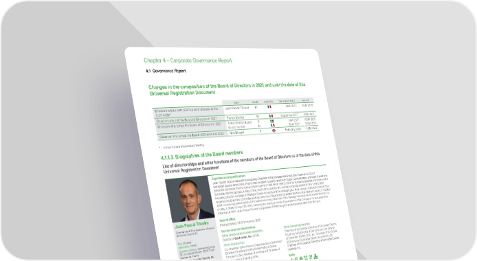 www.se.com Schneider Electric Universal Registration Document 2021 272 Chapter 4 – Corporate Governance Report Changes in the composition of the Board of Directors in 2021 and until the date of this Universal Registration Document Name Gender Nationality Date of appointment Term end Directors whose term of office was renewed at the 2021 AGM* Jean-Pascal Tricoire M April 2013 AGM 2025 Directors who left the Board of Directors in 2021 Patrick Montier M September 2017 AGM 2021 Directors who joined the Board of Directors in 2021 Anna Ohlsson-Leijon Bruno Turchet F M April 2021 April 2021 AGM 2025 AGM 2025 Observer who joined the Board of Directors in 2022 Nive Bhagat F February 2022 AGM 2022 * Annual General Shareholders’ Meeting. 4.1.1.2 Biographies of the Board members List of directorships and other functions of the members of the Board of Directors as of the date of this Universal Registration Document Experience and qualifications Jean-Pascal Tricoire has been successively Chairman of the Management Board and Chairman & CEO of Schneider Electric since 2006. Prior to that, he spent his early career with Alcatel, Schlumberger, and Saint-Gobain and joined the Schneider Electric Group (Merlin Gerin) in 1986. From 1988 to 2001, he occupied operational functions within Schneider Electric abroad, in Italy, China, South Africa and the US. He held corporate positions from 1999 to 2001 including Director in charge of Strategic Global Accounts and the strategic plan. From January 2002 to the end of 2003, he joined the Executive Committee as Executive Vice-President of Schneider Electric’s International Division. In October 2003, he was appointed Deputy CEO before becoming Chairman of the Management Board of Schneider Electric SA on May 3, 2006. On April 25, 2013, following the change in mode of governance of the Company, he was appointed Chairman & CEO. Jean-Pascal Tricoire is a graduate of ESEO Angers and obtained an MBA from EM Lyon. Jean-Pascal Tricoire Chairman and Chief Executive Officer of Schneider Electric SE Age: 58 years Nationality: French Business address: Schneider Electric 35, rue Joseph Monier, 92500 Rueil- Malmaison, France 793,239 (1) Schneider Electric SE shares Attendance rate at: Board meetings 100% Term of office First appointed: 2013/Term ends: 2025 Current external directorships Other directorships at listed companies: Director of Qualcomm, Inc. (USA). Other directorships: Co-Chairman of the France-China Business Committee; Director of the Board of the United Nations Global Compact (USA); Member of the Board of Trustees of Northeastern University (USA). Other internal directorships: Chairman of the Board of Directors of Schneider Electric Industries SAS; Director of Delixi Electric Ltd; Director of Schneider Electric USA, Inc.; Chairman of the Board of Directors of Schneider Electric Asia Pacific Ltd; Chairman of the Board of Directors of Schneider Electric Holdings Inc. Skills 4.1 Governance Report Board committees Governance & Remunerations Committee Audit & Risks Committee Investment Committee Digital Committee Human Resources & CSR Committee C Committee Chair