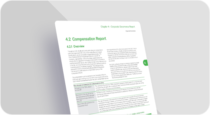 311 Life Is On | Schneider Electric www.se.com Chapter 4 – Corporate Governance Report Corporate Governance 4. 4.2 Compensation Report 4.2.1 Overview Throughout 2021, the Board continued to discuss compensation policy and approach with many of Schneider Electric’s largest shareholders, as well as investor representative bodies. The Vice-Chairman & Lead Independent Director met with 24 investors, representing ~35% of the share capital during two shareholders engagement campaigns dedicated to Governance and Remuneration topics, one in March ahead of the AGM and one in the fall, and reported back to the Governance & Remunerations Committee and to the Board thereafter. This dialogue will be pursued in 2022 to ensure that the Board takes the feedback into account to determine the compensation policy of the Corporate Officers. The compensation paid or granted to the Corporate Officer in 2020 was approved by more than 87% of our shareholders at the 2021 Annual General Meeting and the 2021 compensation policy was supported by 81% of the shareholders at the 2021 Annual Shareholders’ meeting. The Board listened carefully to some comments made by the shareholders during the subsequent engagement with the shareholders. No major concerns were raised. Institutional shareholders have different guidelines and sensitivities which the Board tries to incorporate as much as possible. For 2022, the Board of Directors wishes to maintain the overall stability of the compensation policy which demonstratedly drives the right behaviours, appears balanced, provides market competitive pay, ensures a strong link between pay and performance, strong alignment with both employees and shareholders, and long-term focus, while at the same time taking into account the shareholders’ feedbacks. The Board proposes the following changes for 2022: Key changes proposed in the Compensation policy Stringency of the TSR criterion for the LTIP The vesting for the criterion of TSR compared to a bespoke industry panel of 11 companies would be made more stringent, with no vesting at ranks 7 and below in the bespoke peer group. No vesting under the median of the group would be allowed. Disclosure of the targets set for the improvement of the adjusted Earnings per share criterion for the LTIP The Board is also committing to disclose ex-post the targets of improvement of the adjusted Earnings per share which will allow shareholders to assess their stringency and the link between pay and performance. Cap of the LTIP granted to the Corporate Officer The cap of long-term instruments that could be granted to the Corporate Officer was previously expressed in number of shares, no more than 60,000 shares. The Board proposes that the cap be now expressed as a percentage of his remuneration (fixed and variable short-term compensation at target). Notably, the long-term instruments granted to the Corporate Officer, valued in accordance with IFRS standards, should not represent a disproportionate percentage of his overall compensation, and should be no more than 200% of the combined fixed and short-term variable compensation at target. Group’s strategic priorities How the strategy links to the Corporate Officers’ variable compensation Long-term incentive plan Annual incentive plan Delivering strong execution and creating value for customers and shareholders every year to contribute to Schneider Electric’s long-term success, in line with the financial objectives communicated to the market Building an integrated and leading company with strong sustainability focus and attractive returns to shareholders Group organic sales growth 40% Group adjusted EBITA margin improvement 30% Group cash conversion rate 10% Schneider Sustainability Impact 20% Adjusted Earnings Per Share 40% Relative Total Shareholder Return 35% Schneider Sustainability External & Relative Index 25% Organic growth Value for customers Sustainability Continuous efficiency Value & returns to shareholders
