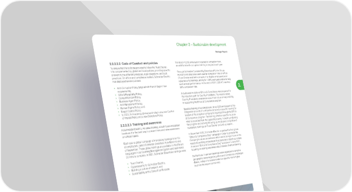97 Life Is On | Schneider Electric www.se.com Chapter 2 – Sustainable development Strategic Report 2. 2.2.2.2.2 Code of Conduct and policies To ensure that the tools are provided to follow the Trust Charter, it is complemented by global and local policies, providing specific answers to the different principles, legal obligations, and local practices. On ethics and compliance matters, Schneider Electric has deployed several policies: • Anti-Corruption Policy (aligned with French Sapin II law requirements), • Gifts & Hospitality Policy, • Competition Law Policy, • Business Agent Policy, • Anti-Harassment Policy, • Human Rights Policy, and • Export Control Policy. • In 2021, Schneider published and rolled out a new Conflict of Interest Policy and a new Donations Policy. 2.2.2.2.3 Training and awareness At Schneider Electric, we value training, at both local and global levels as it is the best way to prevent risks and raise awareness on ethical topics. Each year a global campaign of mandatory trainings is run for all employees, called Schneider Essentials , from March to end of September. These global trainings are available in 18 different languages in our Learning Management System and each takes 30 mins to complete. In 2021, Schneider Essentials trainings were: • Trust Charter, • Cybersecurity for Schneider Electric, • Building a culture of respect, and • Sustainability at the Core of our Purpose. For about 40,000 employees exposed to corruption risks, an additional anti-corruption training is required each year. Through Schneider Sustainability Essentials #13, the Group monitors and discloses each quarter completion rate on ethics (Trust Charter and anti-corruption for eligible employees) and cybersecurity trainings, aiming for 100% each year and externally audit annual performance. At the end of 2021, SSE #13 reached 96% completion rate. A dedicated module on Ethics & Compliance was prepared for the induction path for Country Presidents. The module raises Country Presidents awareness about their role and responsibility in supporting the Ethics & Compliance program. Besides training of our employees, since 2020 and as part of the integration process of companies acquired, a specific training for leaders of the acquired company is organized through the Ethics & Compliance program. The training entails a specific focus on what is expected from the leadership teams, including endorsing the program and actively following up employees completion of mandatory trainings on Trust Charter and anti-corruption. In November 2020, Schneider Electric organized its first global “Ethics & Compliance Day” campaign in order to promote the Company’s values on business ethics and to bring a focus on the need of a working environment that promotes a speak-up culture. A second “Ethics & Compliance Day” took place in June 2021, focusing on raising awareness about biases of ethical thinking. Furthermore, in-person learnings were organized in sensitive geographic areas regarding ethics and compliance challenges (Brazil, India) or in locations where a specific risk is higher (such as the export control risk). 100% of employees trained every year on Cybersecurity and Ethics Feedback received from our employees confirm that our trainings efficiently help them to act as “integrity ambassadors”. Cybersecurity training: “Very much anchored in real life both professional and personal. Did not see the 30m pass. Way to go!” Principles of Responsibility training: “I love the fact that this course reminds you the basics and makes you use your brain and put yourself in the shoes of colleagues in difficult situations. Love the voice of so many of our colleagues too!” Anticorruption training: “The content is simple and easy to understand. This is a must for any Schneider employee.” Tr ust SSE #13 100% 90% Baseline 2025 target 2021 Progress 0 100 96%