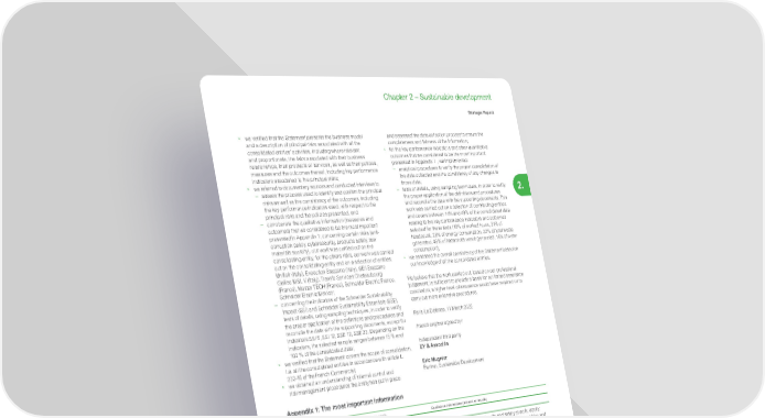 225 Life Is On | Schneider Electric www.se.com Chapter 2 – Sustainable development Strategic Report 2. • we verified that the Statement presents the business model and a description of principal risks associated with all the consolidated entities’ activities, including where relevant and proportionate, the risks associated with their business relationships, their products or services, as well as their policies, measures and the outcomes thereof, including key performance indicators associated to the principal risks; • we referred to documentary sources and conducted interviews to − assess the process used to identify and confirm the principal risks as well as the consistency of the outcomes, including the key performance indicators used, with respect to the principal risks and the policies presented, and − corroborate the qualitative information (measures and outcomes) that we considered to be the most important presented in Appendix 1; concerning certain risks (anti- corruption policy, cybersecurity, products safety, raw materials scarcity), our work was carried out on the consolidating entity, for the others risks, our work was carried out on the consolidating entity and on a selection of entities: Uniflair (Italy), Execution Stezzano (Italy), SEII Stezzano Galileo M&L V (Italy), Transfo Services Chateaubourg (France), Master TECH (France), Schneider Electric France, Schneider Electric Mexico; − concerning the indicators of the Schneider Sustainability Impact (SSI) and Schneider Sustainability Essentials (SSE), tests of details, using sampling techniques, in order to verify the proper application of the definitions and procedures and reconcile the data with the supporting documents, except for indicators SSI 6, SSI 12, SSE 12, SSE 23. Depending on the indicators, the selected sample ranges between 15 % and 100 % of the consolidated data; • we verified that the Statement covers the scope of consolidation, i.e. all the consolidated entities in accordance with article L. 233-16 of the French Commercial; • we obtained an understanding of internal control and risk management procedures the entity has put in place and assessed the data collection process to ensure the completeness and fairness of the Information; • for the key performance indicators and other quantitative outcomes that we considered to be the most important presented in Appendix 1 , we implemented: − analytical procedures to verify the proper consolidation of the data collected and the consistency of any changes in those data; − tests of details, using sampling techniques, in order to verify the proper application of the definitions and procedures and reconcile the data with the supporting documents. This work was carried out on a selection of contributing entities and covers between 14% and 49% of the consolidated data relating to the key performance indicators and outcomes selected for these tests (18% of worked hours, 21% of headcount, 28% of energy consumption, 32% of total waste generated, 49% of hazardous waste generated, 14% of water consumption); • we assessed the overall consistency of the Statement based on our knowledge of all the consolidated entities. We believe that the work carried out, based on our professional judgement, is sufficient to provide a basis for our limited assurance conclusion; a higher level of assurance would have required us to carry out more extensive procedures. Paris-La Défense, 11 March 2022 French original signed by: Independent third party EY & Associés Eric Mugnier Partner, Sustainable Development Appendix 1: The most important information Quantitative Information (including key performance indicators) Qualitative Information (actions or results) Social Information Five Schneider Sustainability Impact (SSI) indicators and eleven Schneider Sustainability Essentials (SSE) indicators related to health and safety, equity, diversity and inclusion, creating equal opportunities and living up to Schneider Electric principles of trust. Other indicators: • Headcount (including by gender), hires and departures, • Number of training hours, • Medical incident rate, lost-time accident and lost-time days rate, occupational illnesses frequency rate. Results of policies related to health and safety at work, equity diversity and inclusion, well-being at work, talent acquisition and retention. Environmental Information The five Schneider Sustainability Impact (SSI) indicators and eleven Schneider Sustainability Essentials (SSE) indicators related to climate, resources efficiency and environment. Other indicators: • Weight of generated and recovered waste, per waste category, • Water and energy consumption, per energy source, • Sulfur hexafluoride (SF 6 ) consumption and related leaks, • Full greenhouse gases emissions, as per GHG Protocol guidance (scope 1, scope 2 market-based, scope 2 location-based, all scope 3 categories), • Volatile Organic Compounds (VOC) emissions. The results of the policies related to: • Environmental management, • Greenhouse gases emissions, • Natural resources and raw materials management, • Pollution prevention, • Biodiversity management. Societal Information Two Schneider Sustainability Impact (SSI) indicators and three Schneider Sustainability Essentials (SSE) indicators related to ethics and development, harnessing the power of all generations and empowerment of local communities. The results of policies related to cybersecurity and data protection, product safety, harnessing the power of all generations and empowerment of local communities.